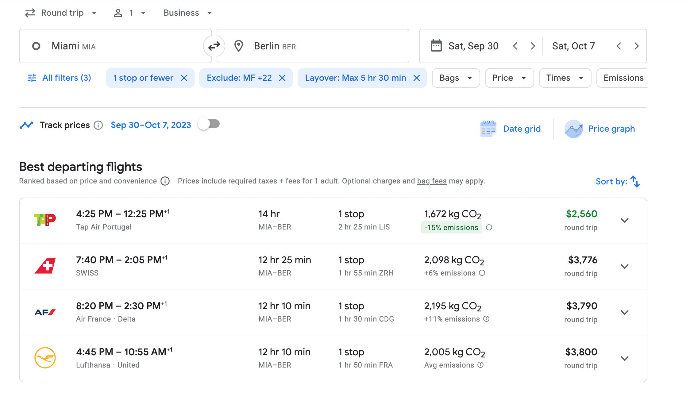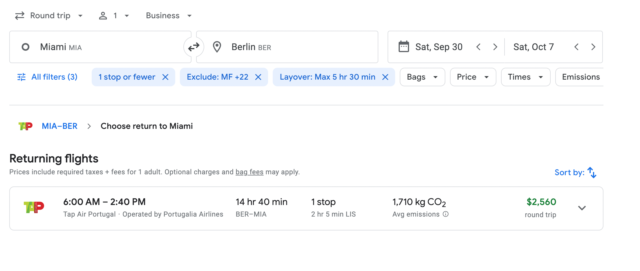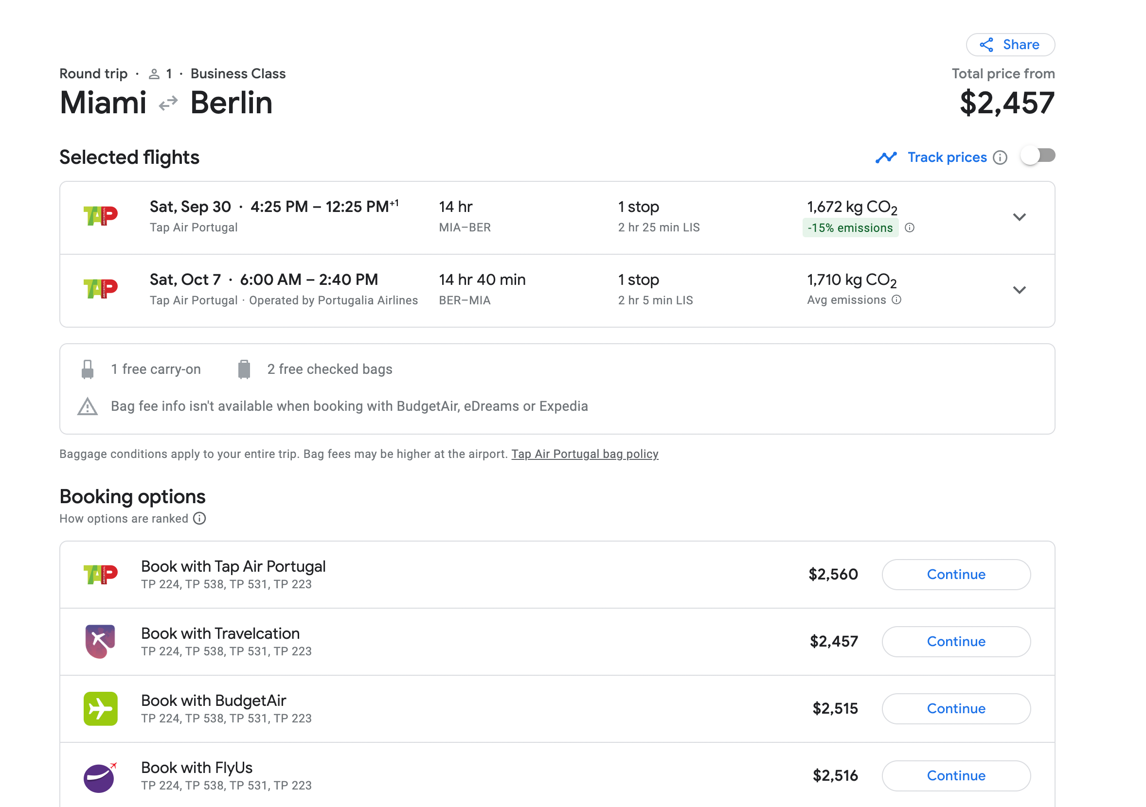 Keep in mind that Google Flights can have price discrepancies due to the availability of third-party options. In this case, Google Flights shows the round-trip business-class fare from Miami to Berlin is $2,457 because that's the lowest price offered by a third-party site. However, if you were to book directly with TAP, the price is $2,560.