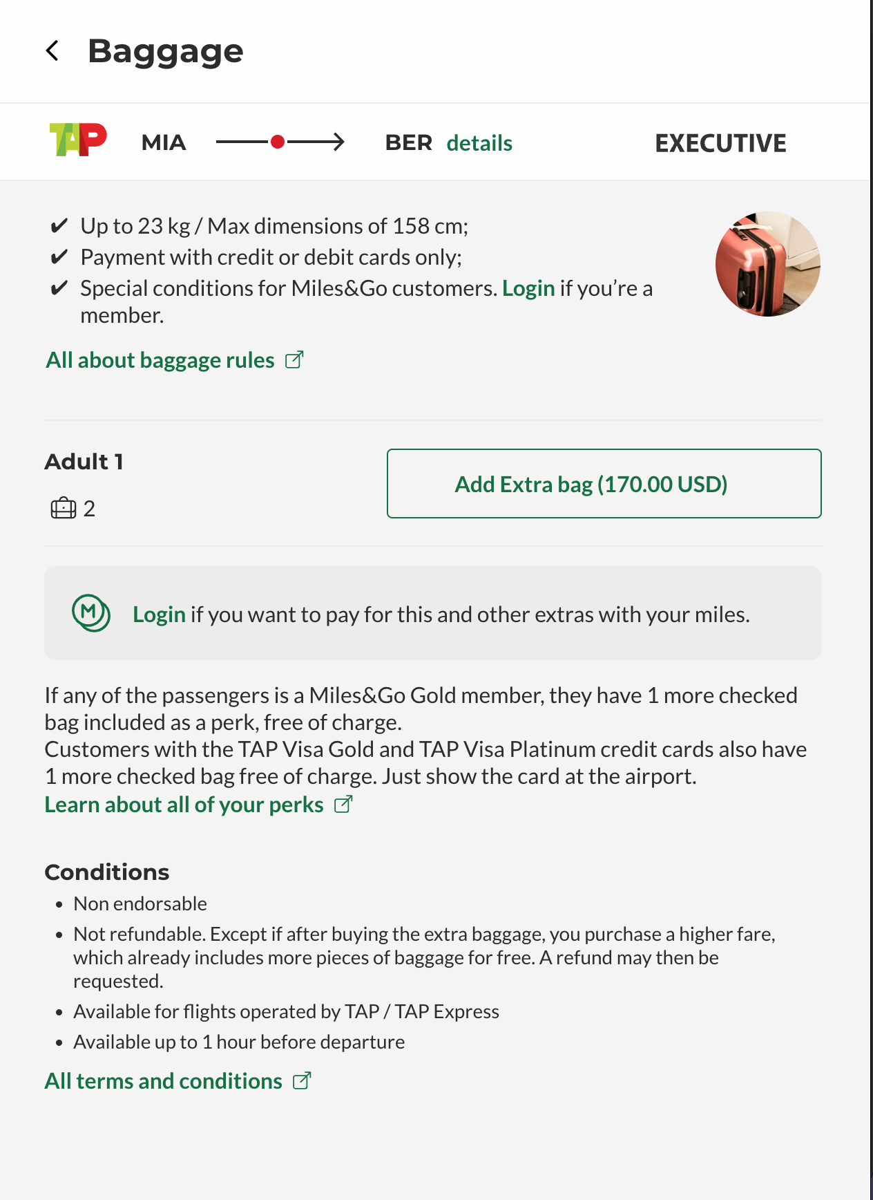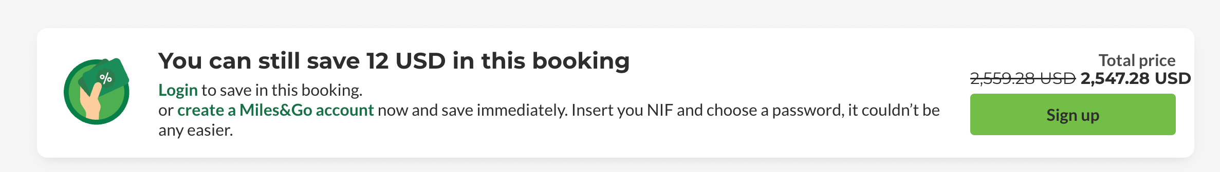 The fare is $2,560, but TAP will take $12 off the fare if you have a Miles&Go account.
