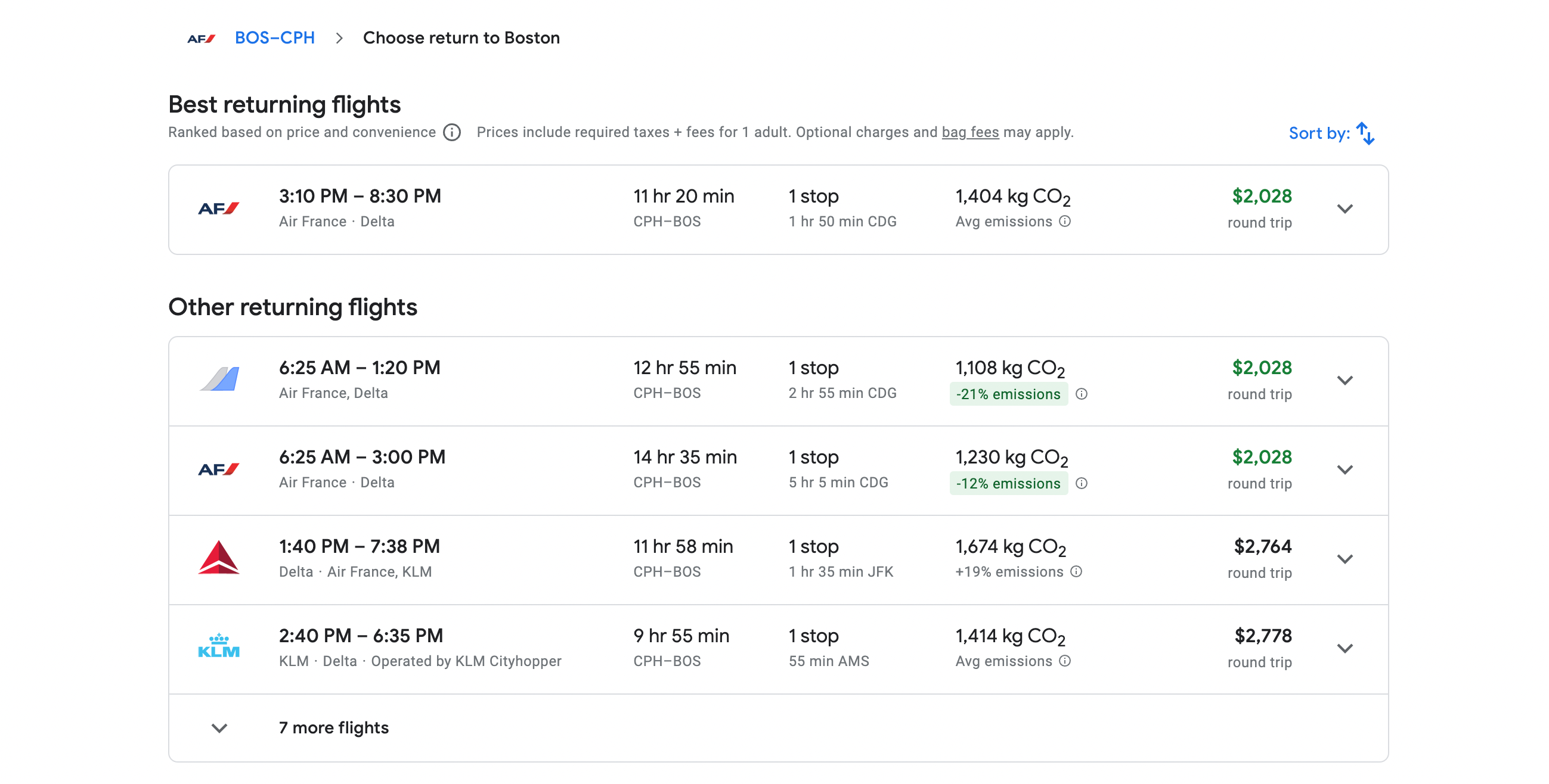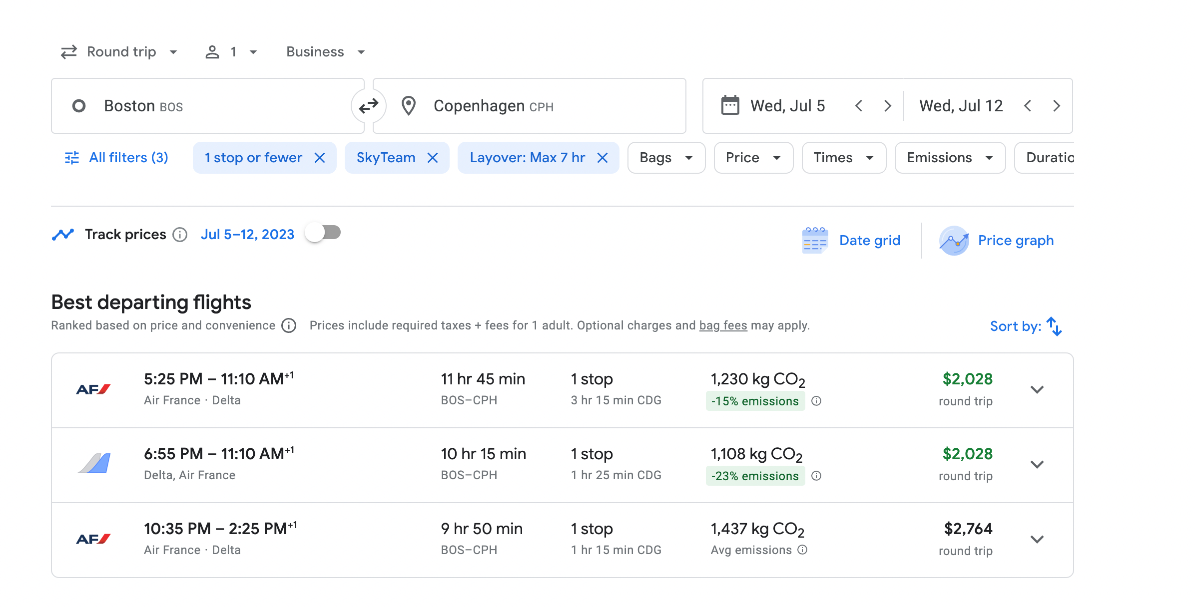 For a flight to Copenhagen from Boston, Google Flights has two options from Delta and Air France priced at $2,028 for a July 5 to 12 trip. One flight leaves at 5:25 p.m., while the other departs at 6:55 p.m. The earlier flight is operated solely by Air France, whereas the latter is operated by both Delta and Air France. Both flights also include a layover in Paris.