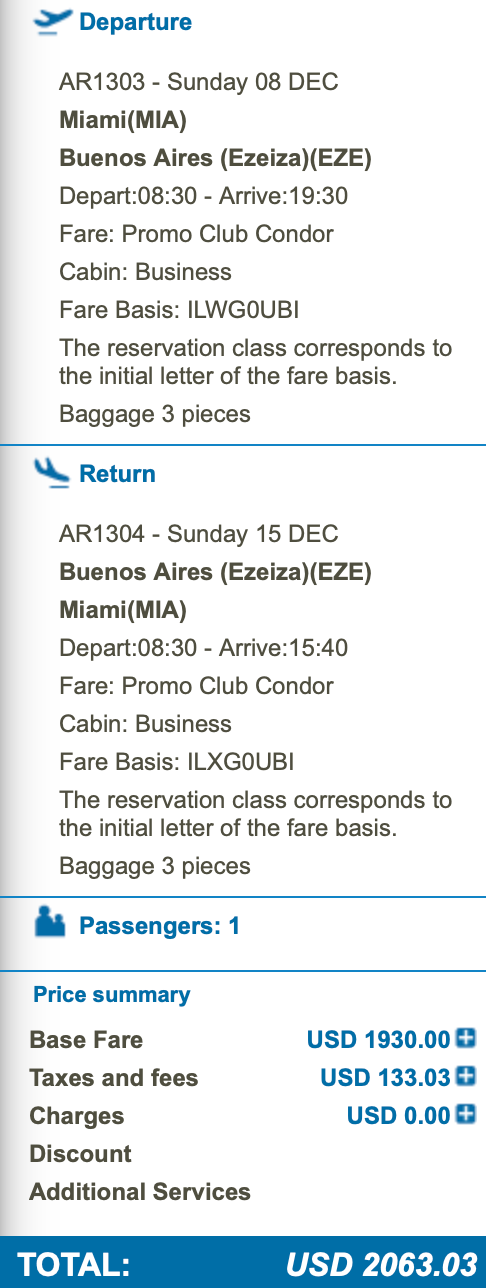 Miami (MIA) to Buenos Aires (EZE) for $2,063 round-trip nonstop on Aerolineas Argentinas in business class: