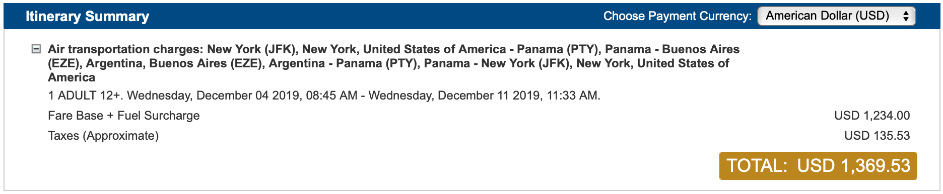 New York (JFK) to Buenos Aires (EZE) for $1,370 round-trip on COPA in business class: