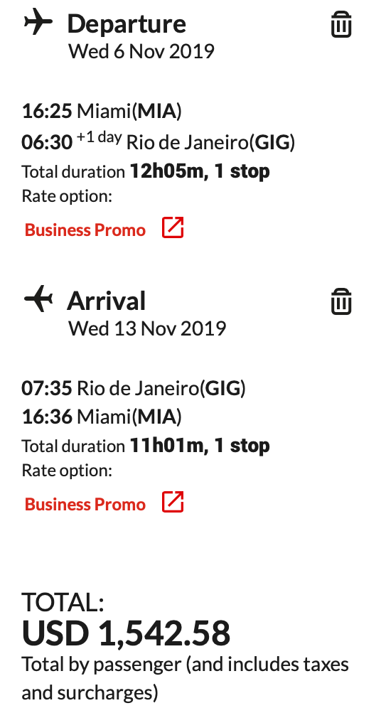 Miami (MIA) to Rio de Janeiro (GIG) for $1,543 round-trip on Avianca in business class: