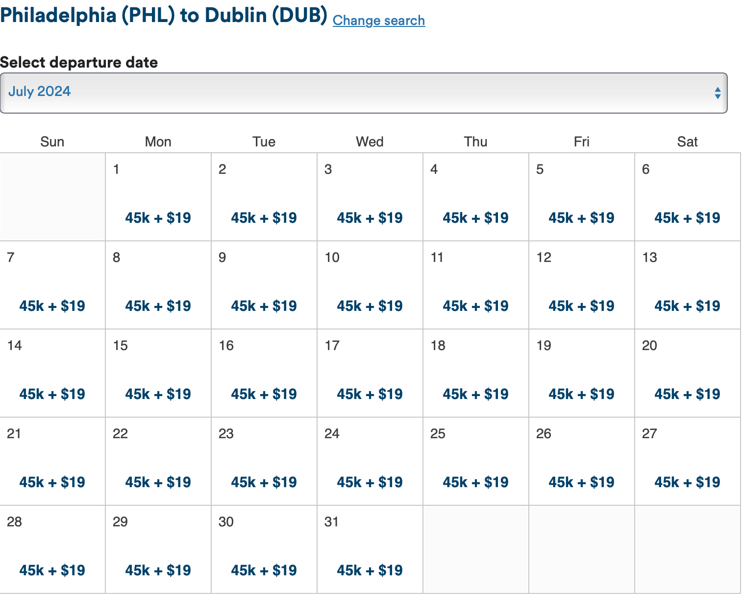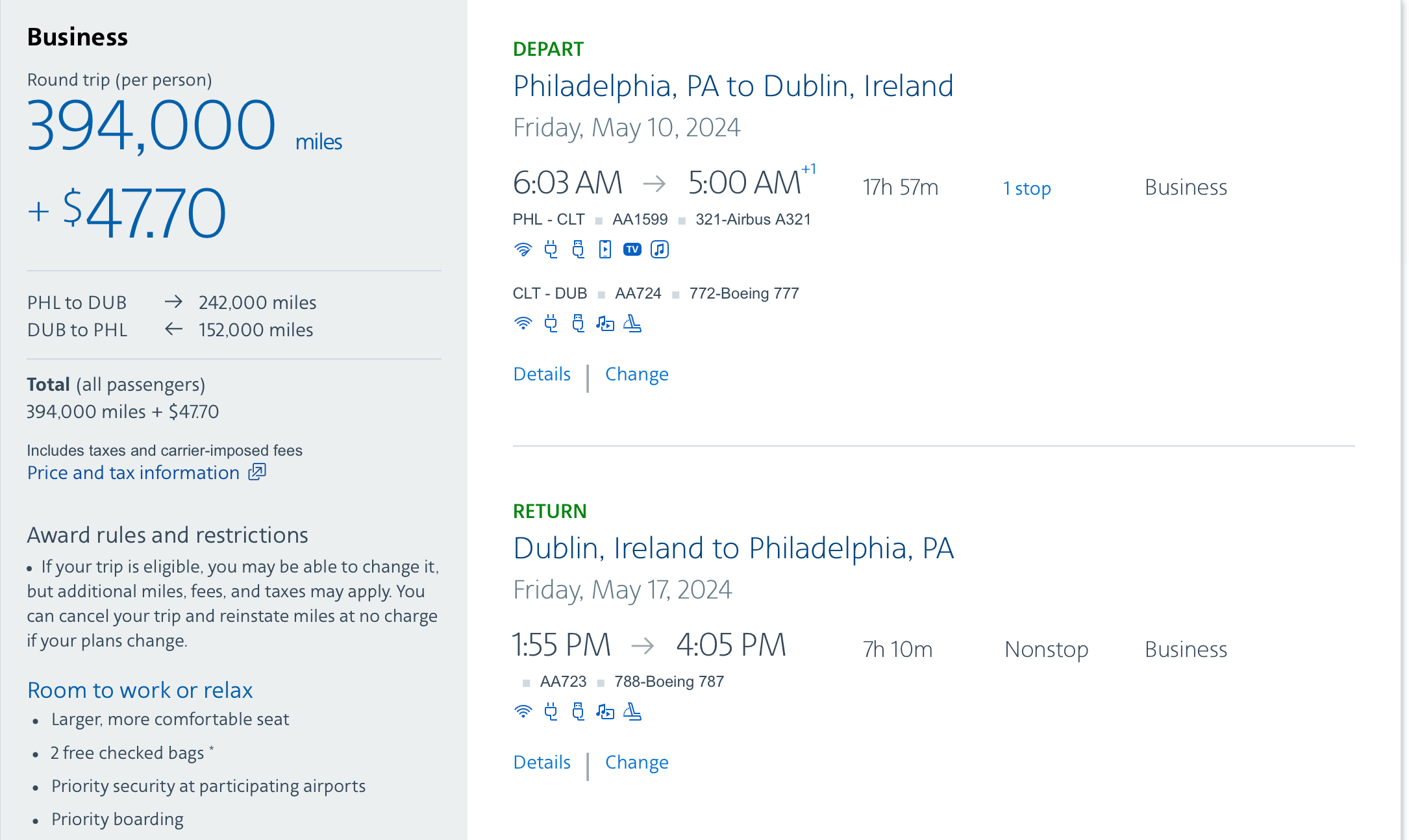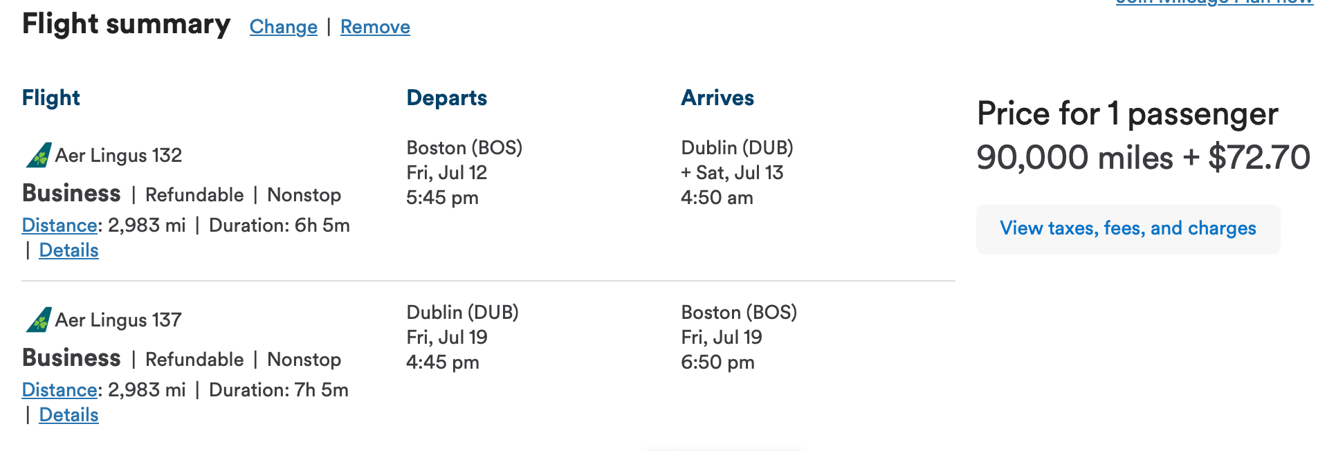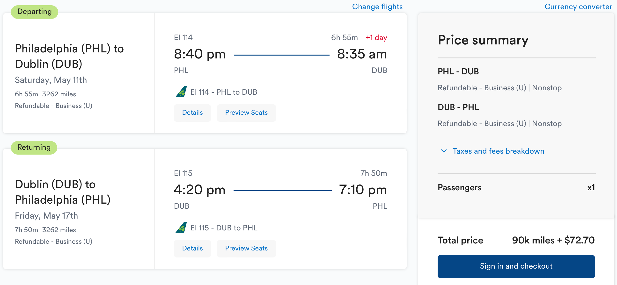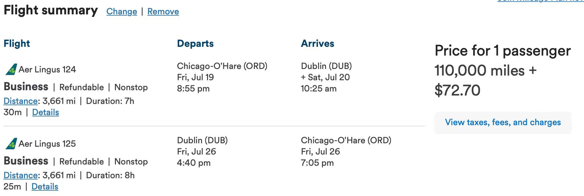 We found lots of available business-class seats throughout the summer out of Philadelphia for only 45K miles each way. This itinerary from Philadelphia International Airport (PHL) to Dublin Airport (DUB) costs just 90K miles and $72.70 in taxes round-trip.