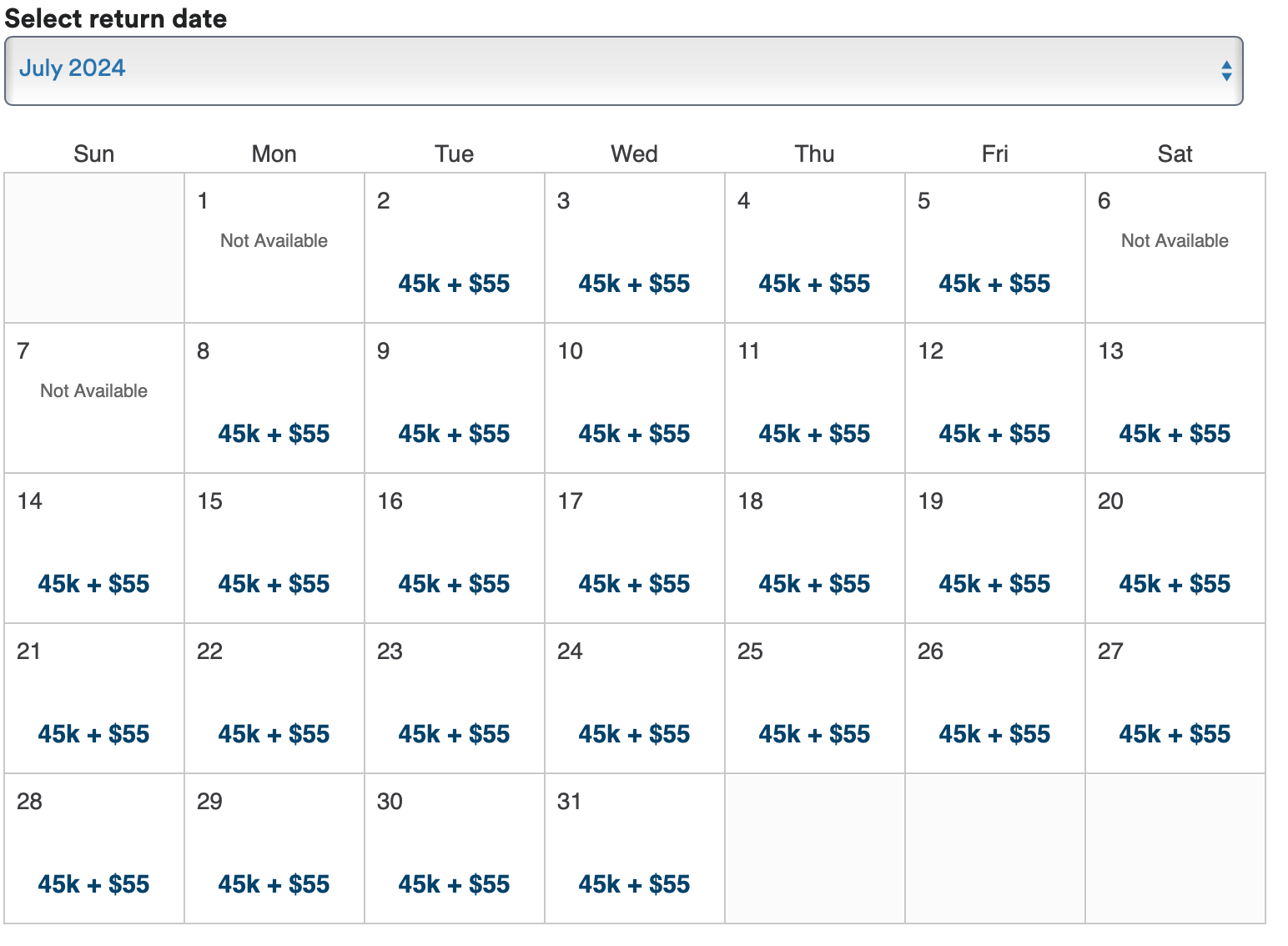 The availability is a bit more limited for flights out of Chicago, but the deals are there if you're OK traveling later in the summer. The best month we saw for award redemptions is July, where you can find biz-class seats for just 55K miles each way. An itinerary like this one below will cost you just 110K miles and $72.70 in taxes round-trip.