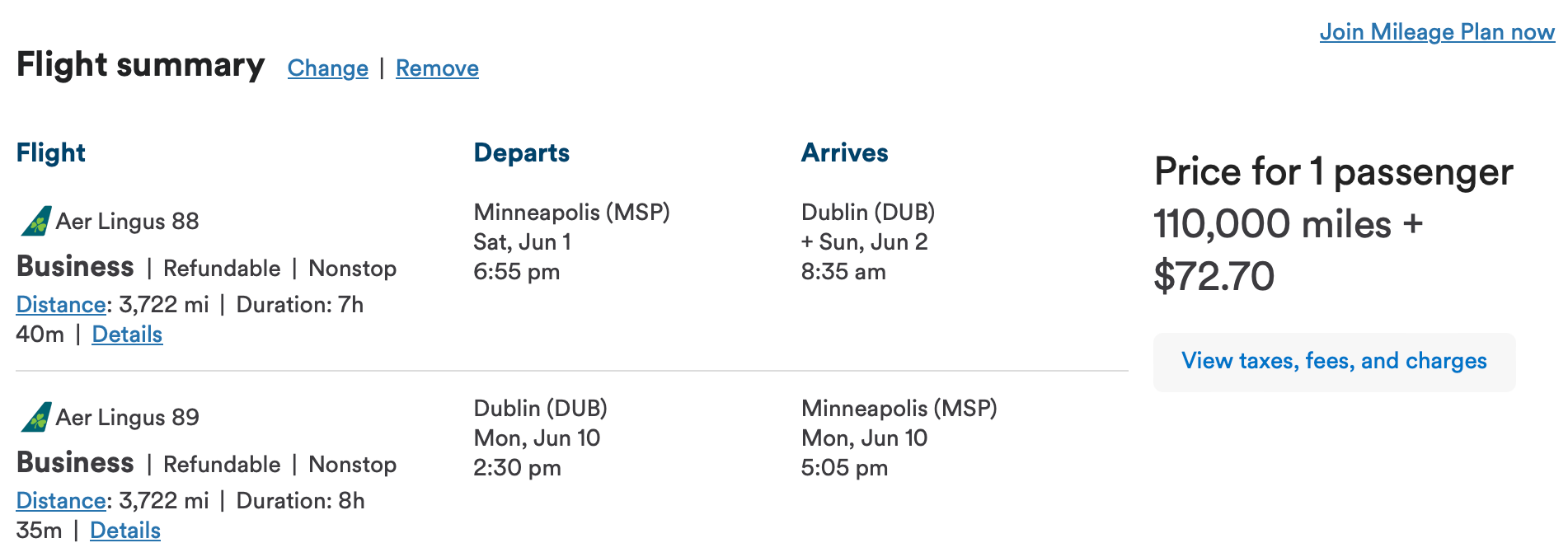 The best availability for redemptions out of Minneapolis is in July and August, with loads of flights available at 55K miles each way. But if you want to book a family vacation to celebrate the start of summer (last day of school in Minneapolis is May 30), you can fly out from Minneapolis–Saint Paul International Airport (MSP) to Dublin on June 1 for only 110K miles and $72.70 in taxes.