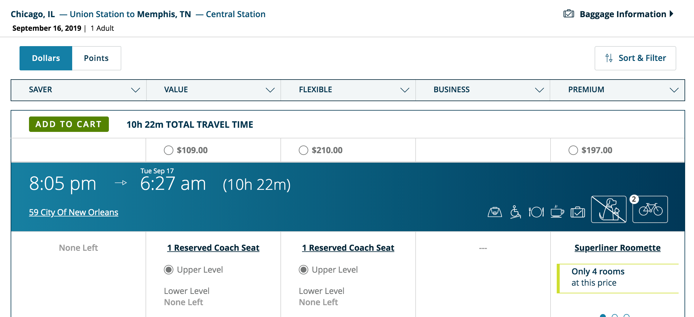 Chicago, IL to Memphis, TN for $109 one-way or $197 one-way in a Roomette for two passengers: