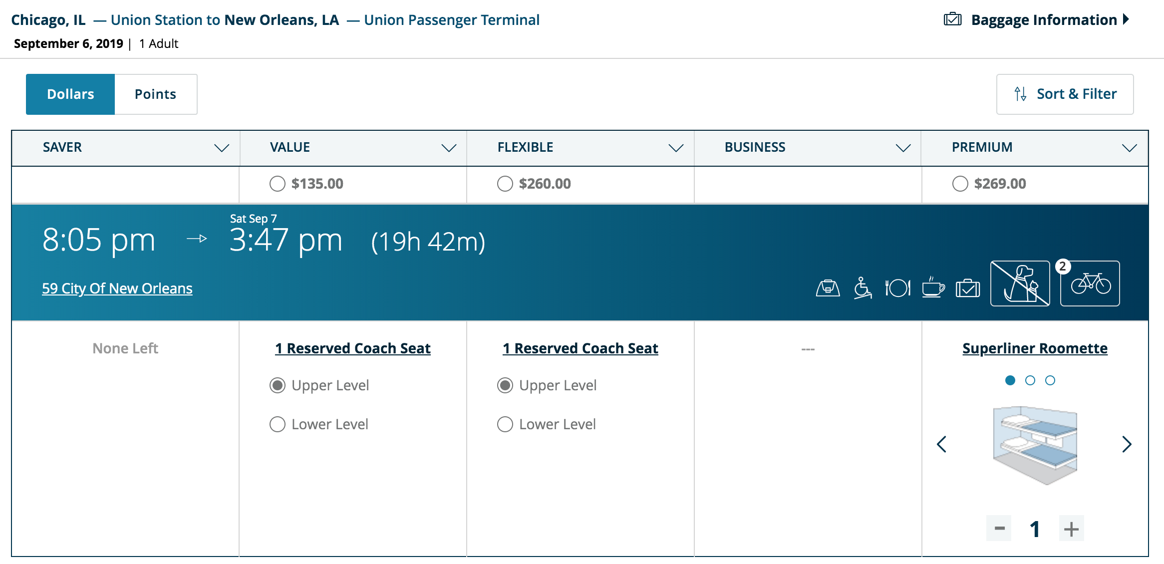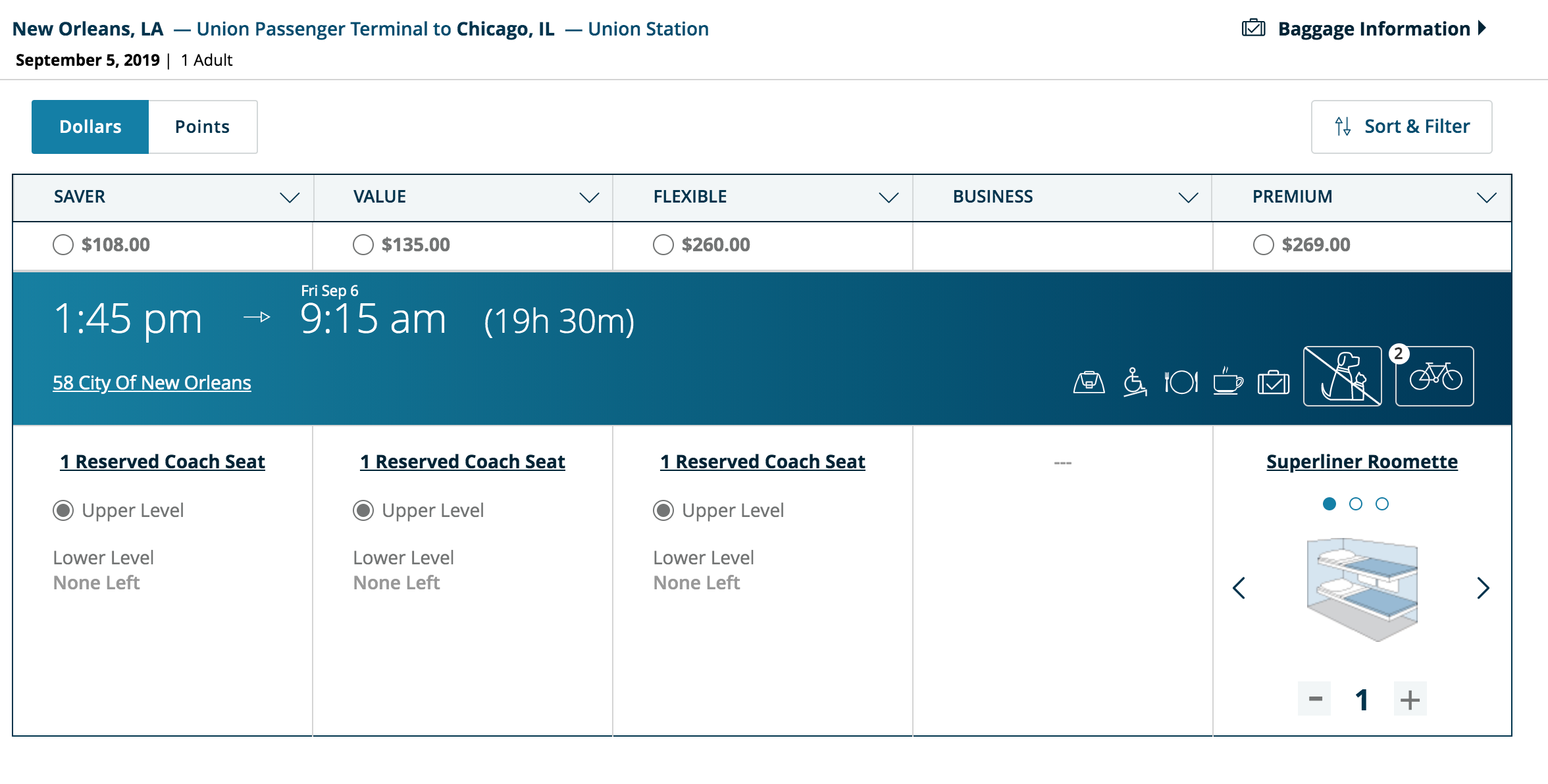 New Orleans, LA to Chicago, IL for $108 one-way or $269 one-way in a Roomette for two passengers: