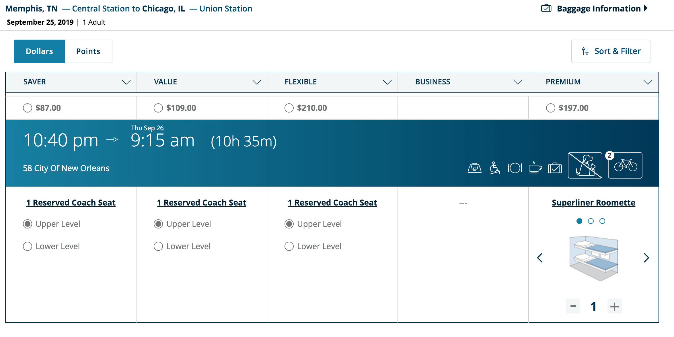 Memphis, TN to Chicago, IL for $87 one-way or $197 one-way in a Roomette for two passengers: