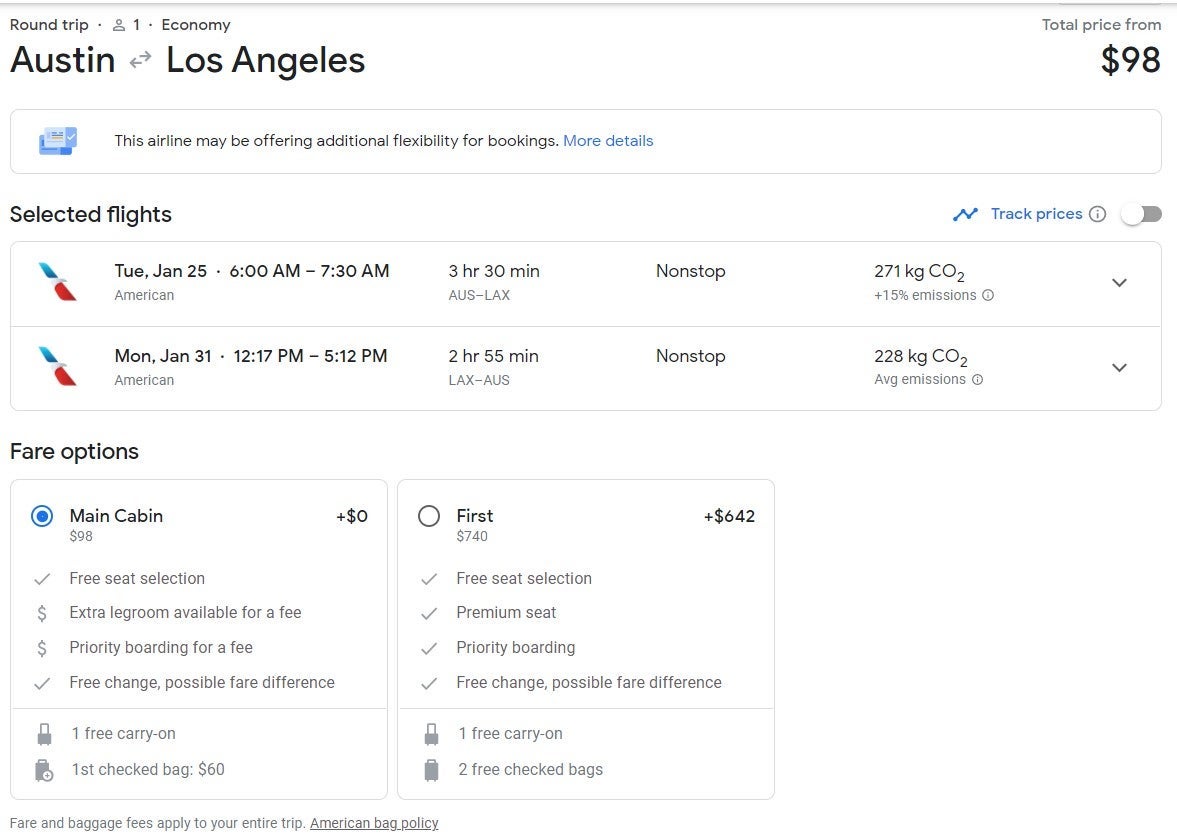 One of the cheapest deals we found was from Austin, Texas (AUS), to Los Angeles (LAX) at $98 round-trip for a nonstop flight at the end of January.