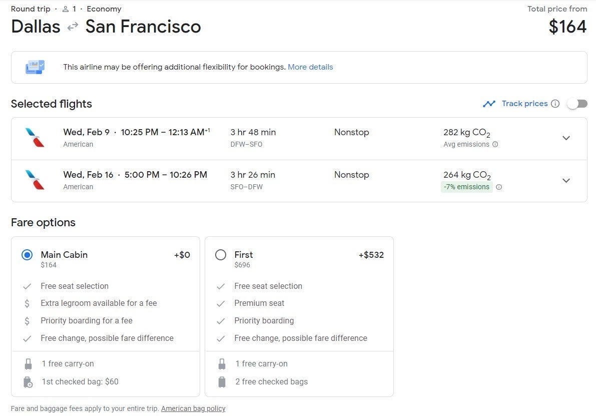 Another departure option is flying from Dallas (DFW) to San Francisco (SFO) for $164 round-trip.
