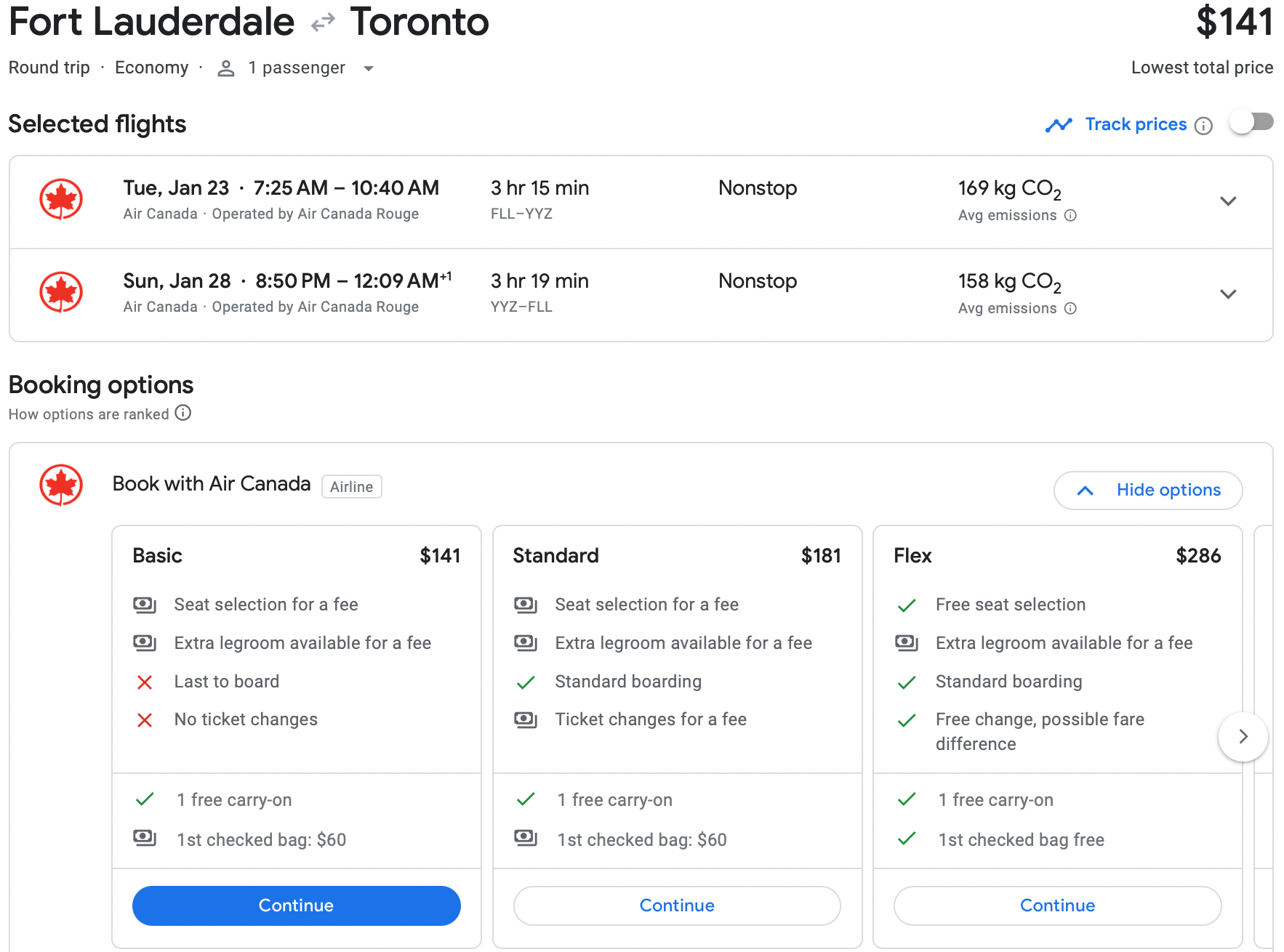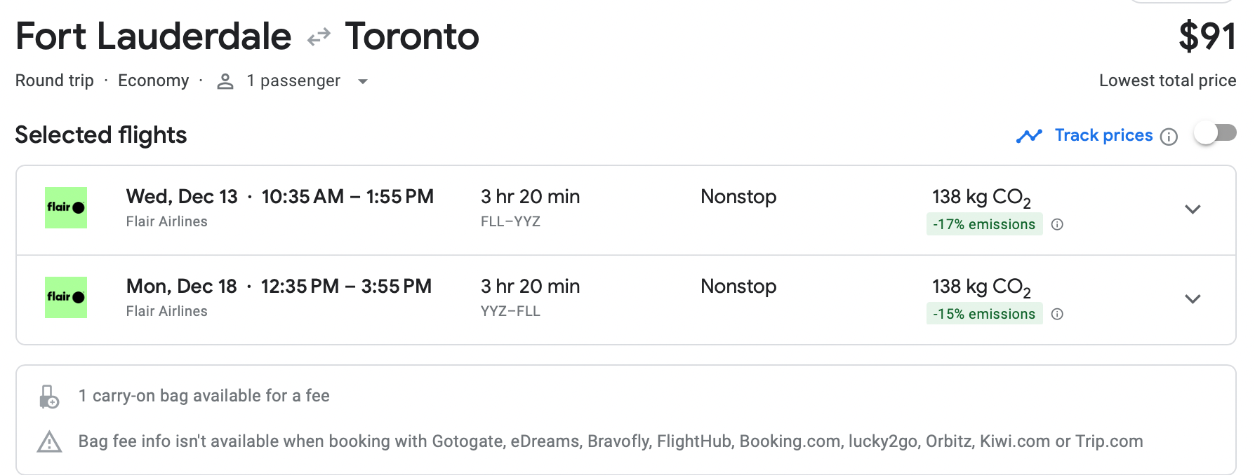 How about a flight from Fort Lauderdale to Toronto for less than $100 roundtrip? We found a few options in that price range in early December on Flair Airlines, flying from Fort Lauderdale International Airport (FLL) to Toronto Pearson International Airport (YYZ). As mentioned above, if you book this, you'll have to pay extra for a full-size carry-on, but it's still a good deal at this price point.