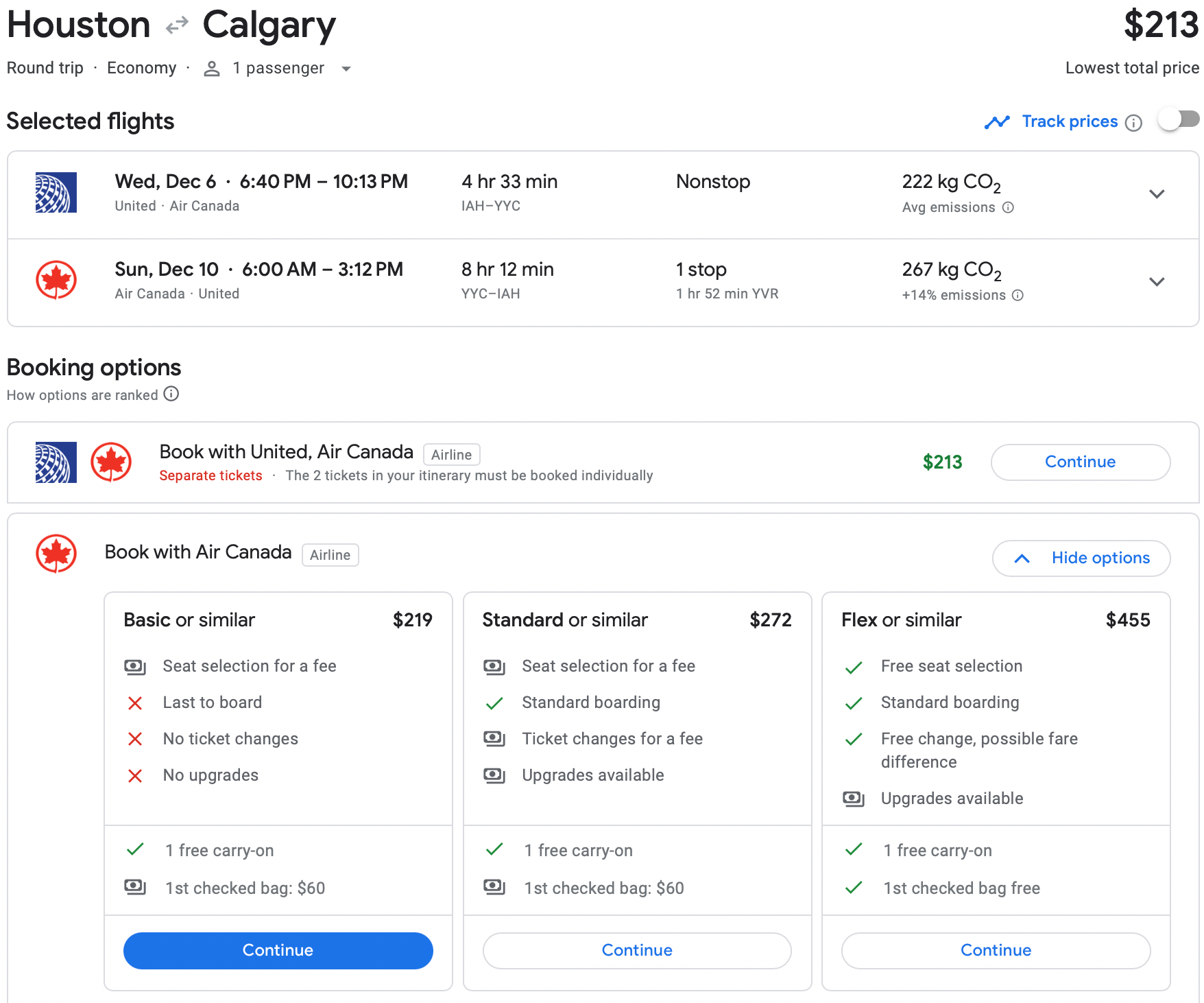 Want to visit Calgary? If you live in Houston, you can fly in mid-December out of George Bush Intercontinental Airport (IAH) to Calgary International Airport (YYC) for just $213 roundtrip. It's a split ticket between United and Air Canada, but you get a free carry-on each way.