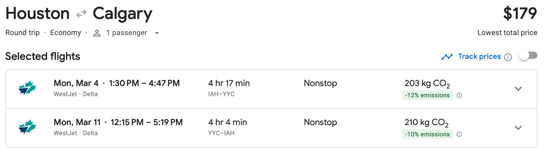 You can book an even cheaper deal for travel in March from Houston to Calgary. This WestJet itinerary is only $179 roundtrip, and it comes with a free carry-on bag.
