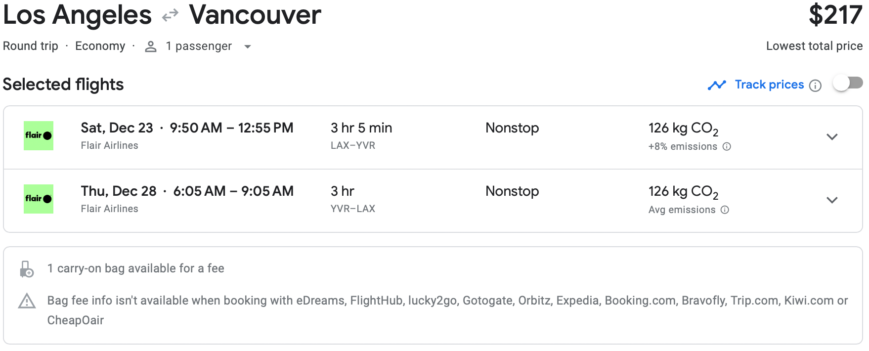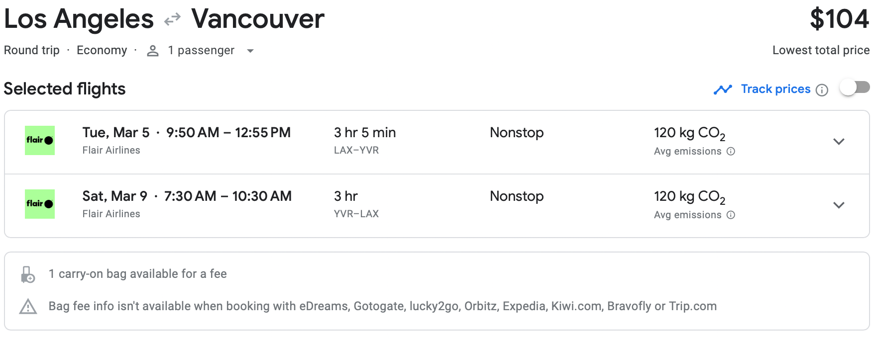 We saw some fantastic prices for Los Angeles-to-Vancouver itineraries. You can fly from Los Angeles International Airport (LAX) to Vancouver International Airport in March for just $104 roundtrip on Flair Airlines. Again, you'll have to pay the upgrade fee to bring a full-size carry-on.