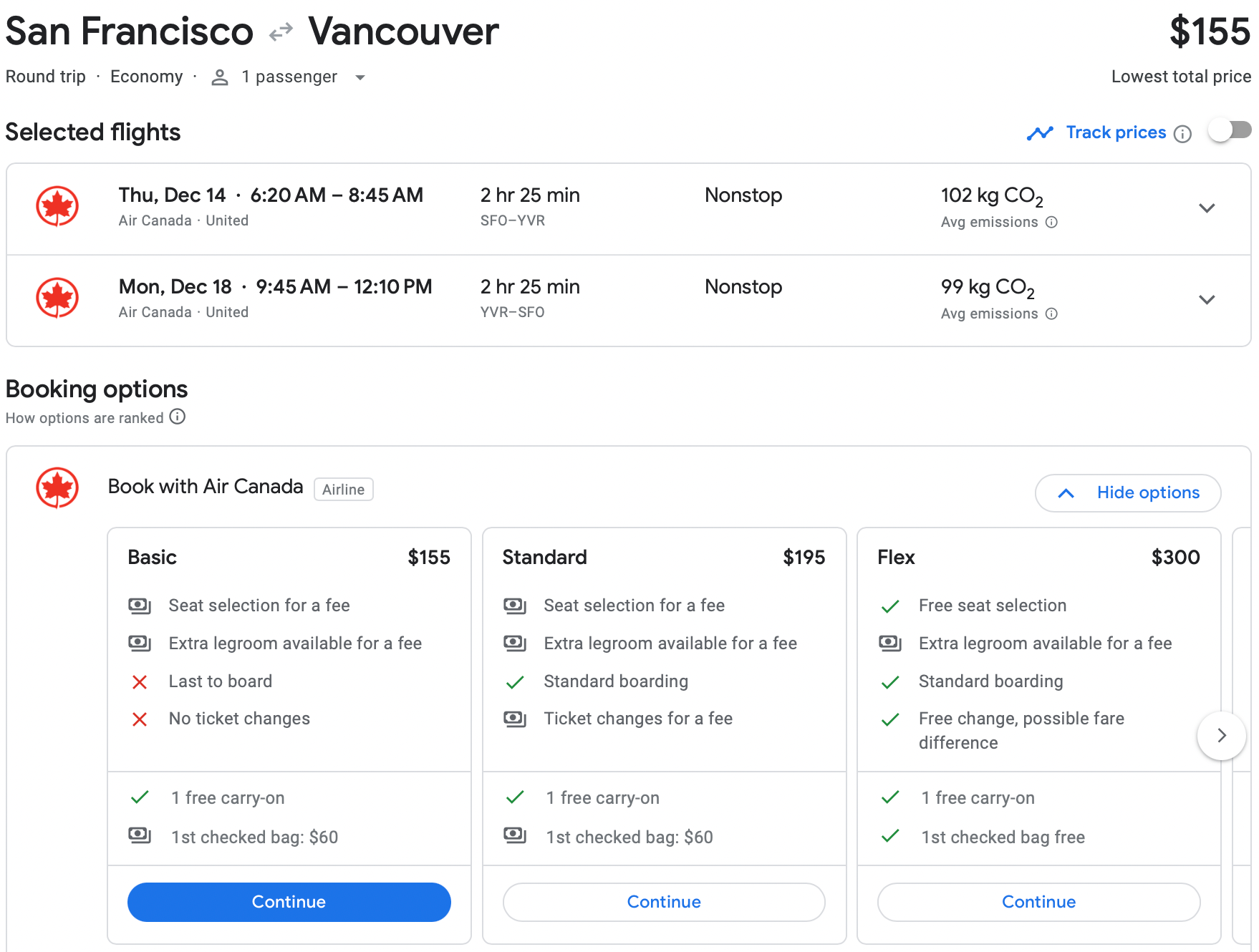 Air Canada and United fares are Economy tier, but they include a carry-on (Checked bags will be between $30-$55 each way). However, if you book a flight with budget airlines Flair or Porter, you'll have to pay an upgrade fee for a full-size carry-on bag.