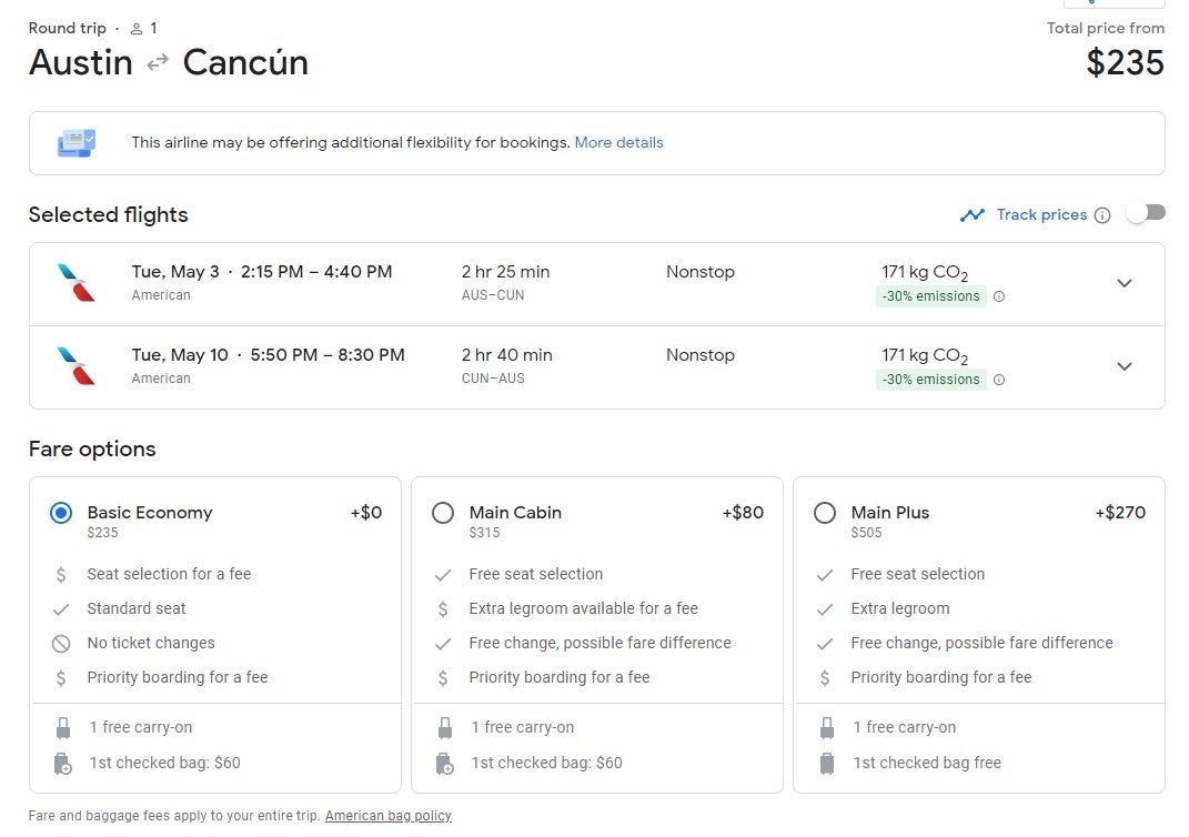 The offers below are for basic economy fares on American Airlines, which include a standard seat and carry-on. A checked bag will cost $30 each way.