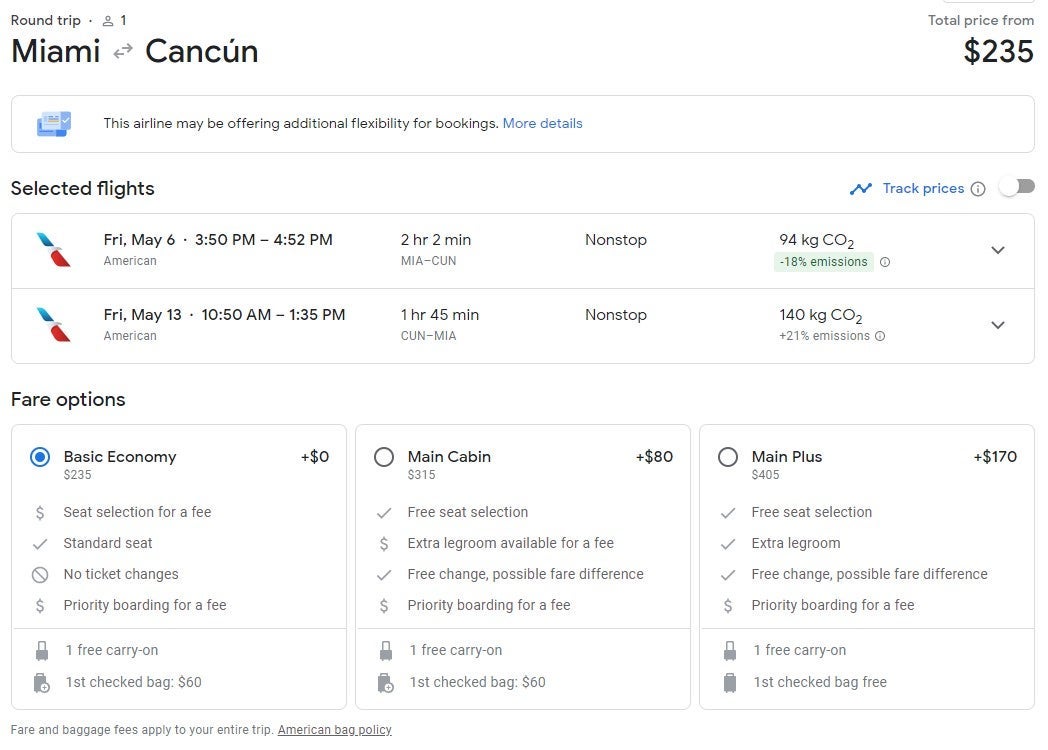 The quickest and one of the cheapest deals we found is from Miami (MIA) to Cancun (CUN) for $235 round-trip. According to Google Flights, this rate is cheaper by almost $200 for the dates below in May.