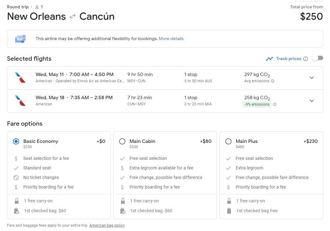 Travelers can go from New Orleans (MSY) to Cancun (CUN) for $250 round trip, over $100 cheaper than usual for these dates in May, according to Google Flights. There is a nearly six-hour stop in Austin (AUS) on the departure flight and about a three-and-a-half-hour stop in Miami (MIA) on the return.