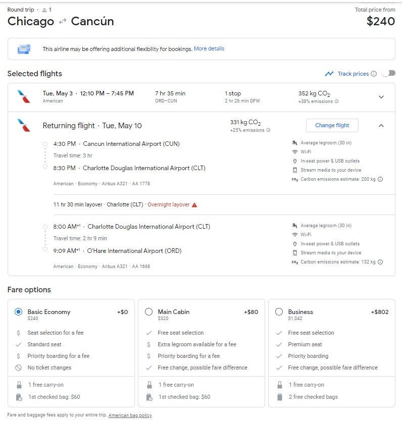 Flights are available from Chicago (ORD) to Cancun (CUN) at $240 round trip. The offer includes a stop in Dallas (DFW) on the departure and an overnight layover in Charlotte (CLT) on the return. The price for this flight is cheaper by over $250 for the dates below, according to Google Flights.