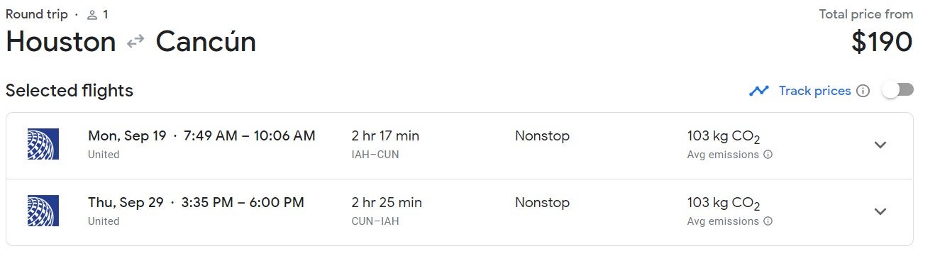 The sample United flight listed here is between Houston and Cancun in late September. Many of the discounted fares are for Monday-to-Monday itineraries like this one, but other date choices are also currently possible. Ticket availability with similar pricing on United tracks through November on selected dates.