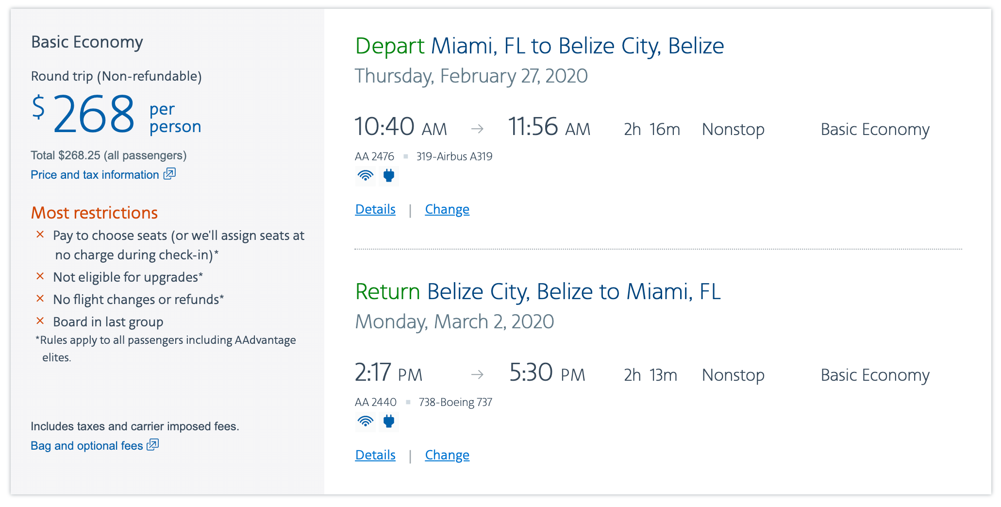 Miami (MIA) to Belize City (BZE) for $268 round-trip on American basic economy: