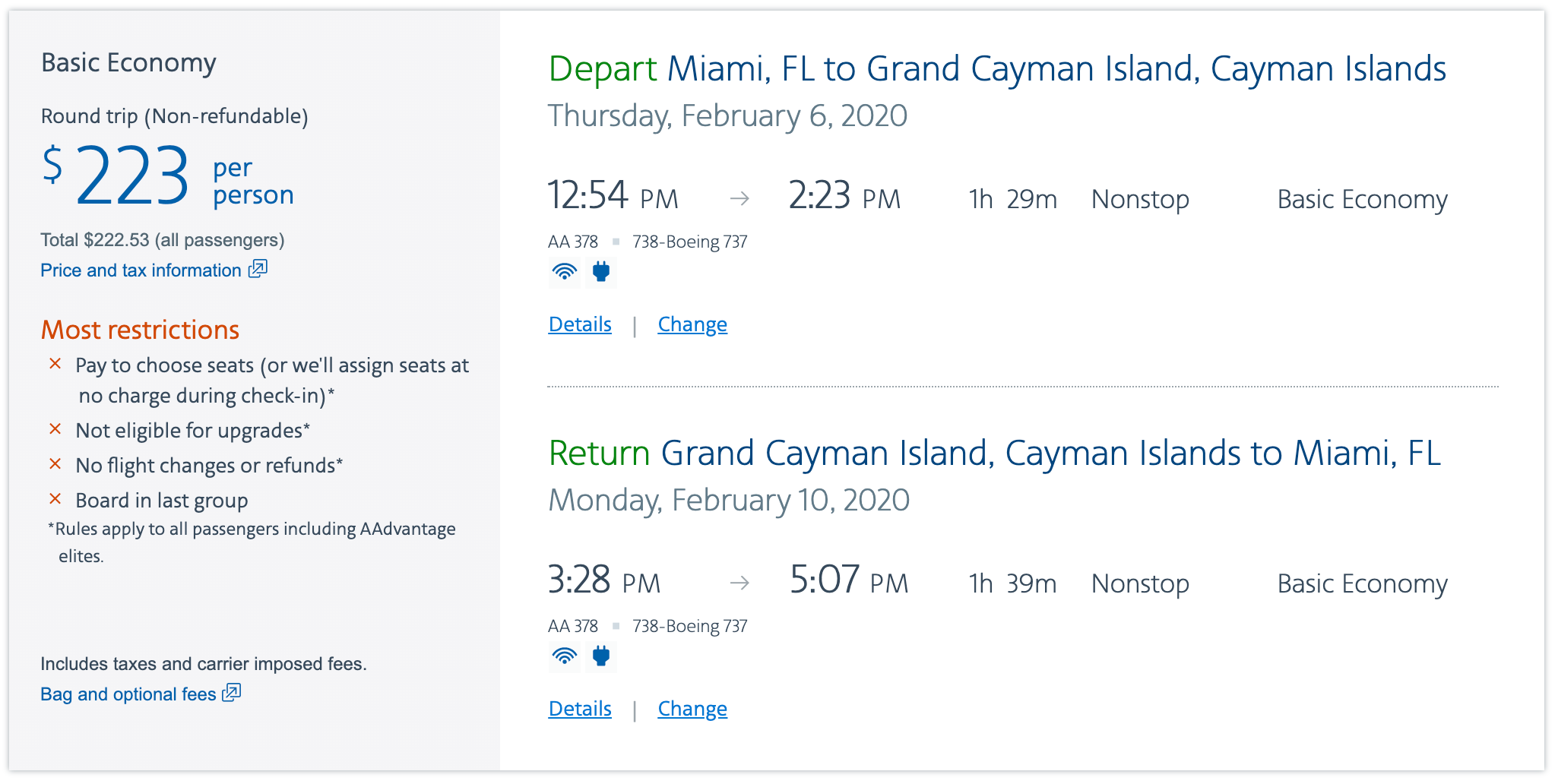 Miami (MIA) to Grand Cayman Islands (GCM) for $223 round-trip on American basic economy: