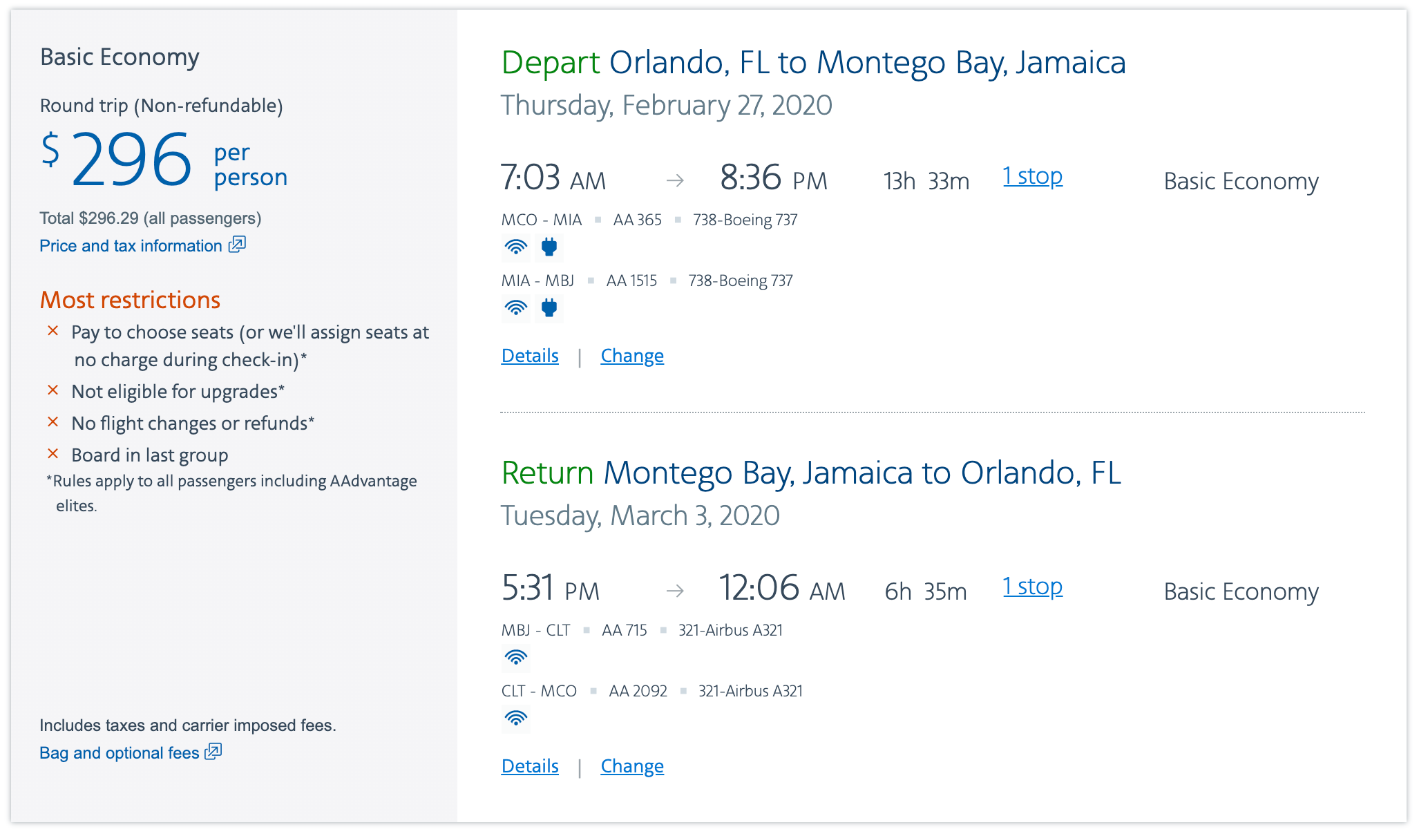 Orlando (MCO) to Montego Bay, Jamaica (MBJ) for $296 round-trip on American basic economy: