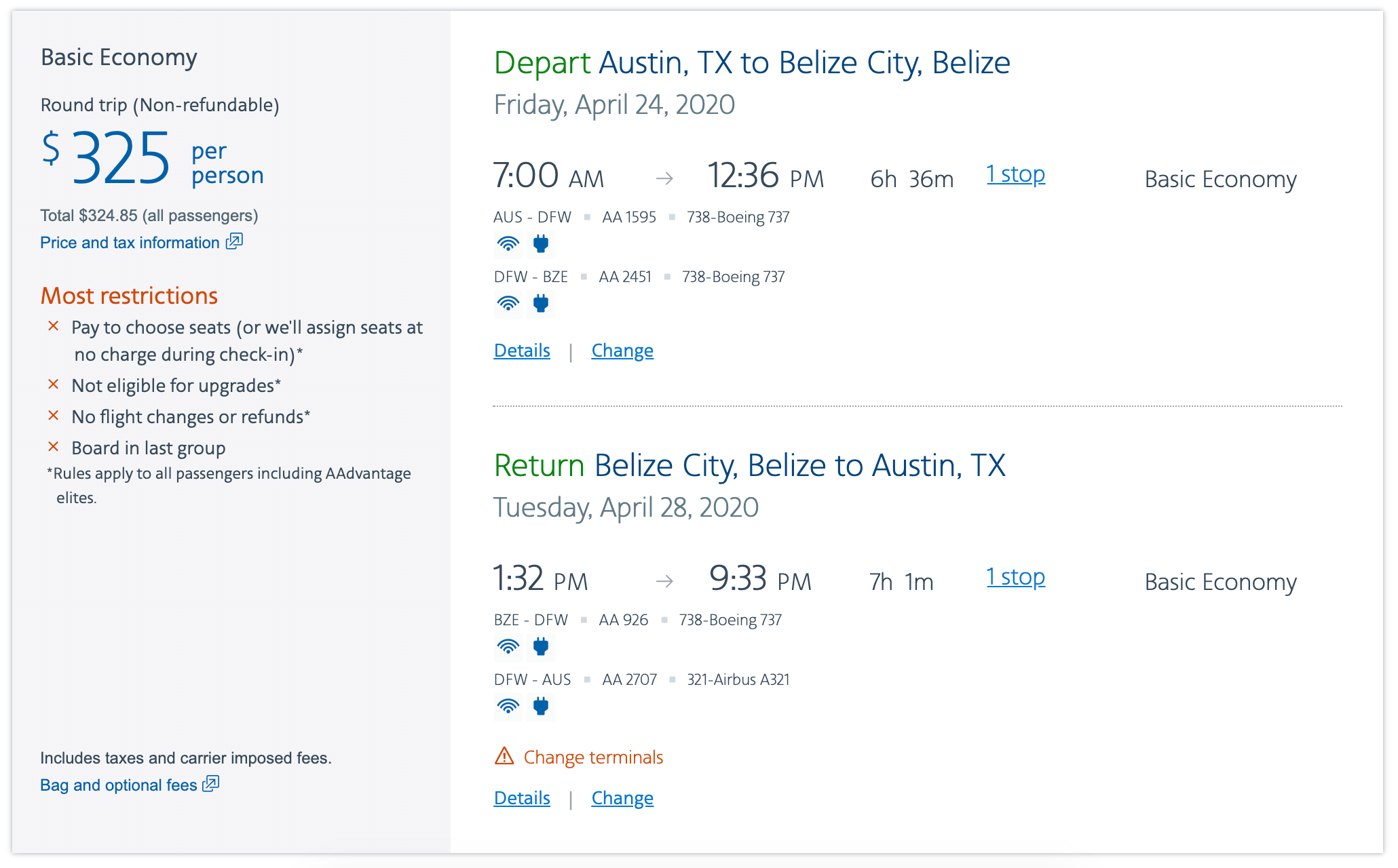 Austin (AUS) to Belize City (BZE) for $325 round-trip on American basic economy: