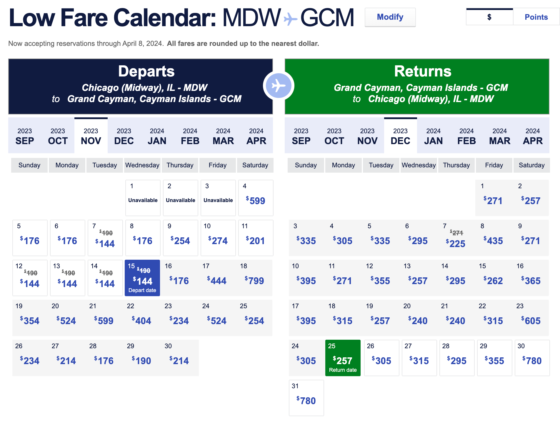 Southwest flights are not available on Google Flights, but you can search your desired routes and dates via Southwest's Low Fare Calendar to book. All Southwest flights include one personal item, one carry-on and two checked bags.