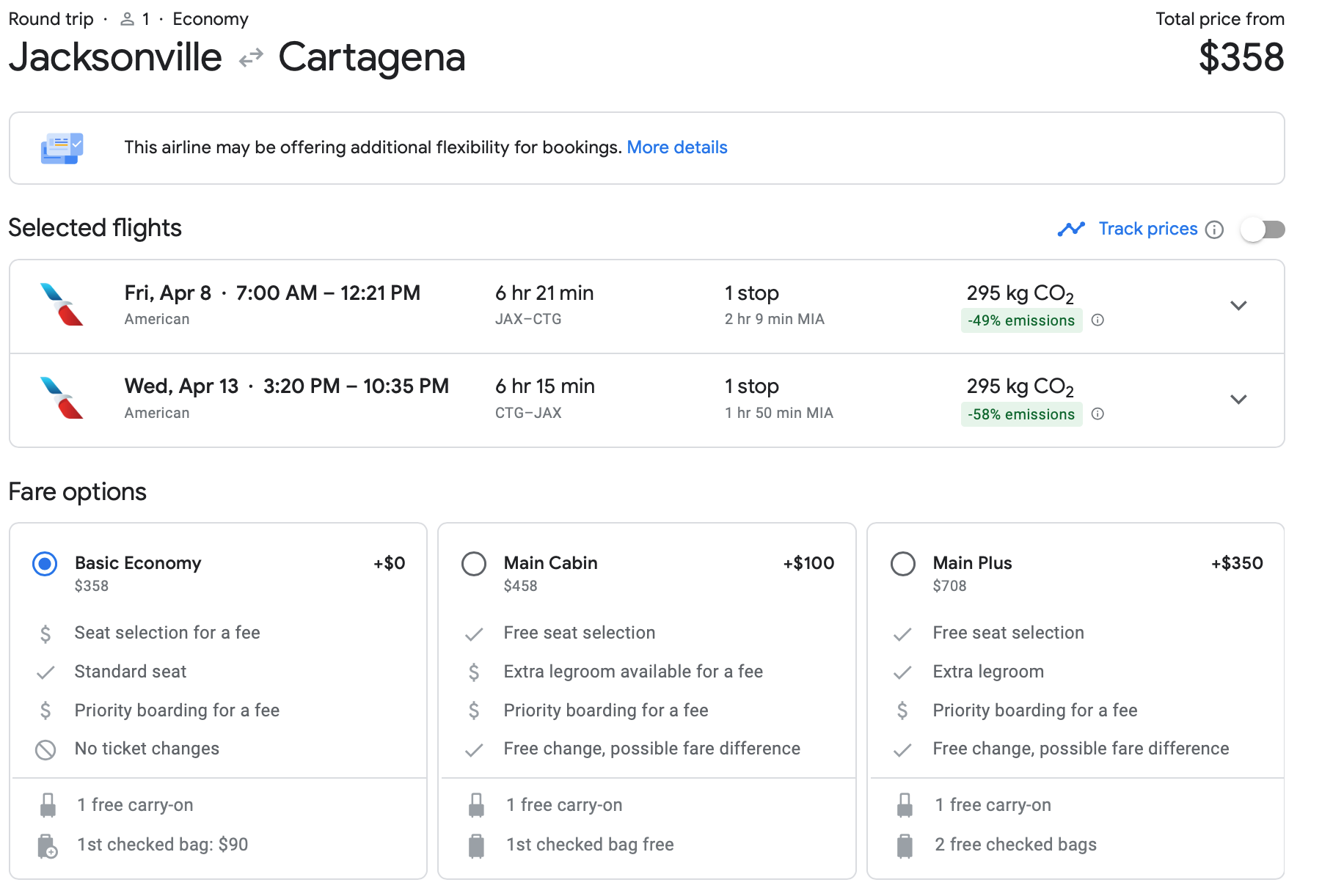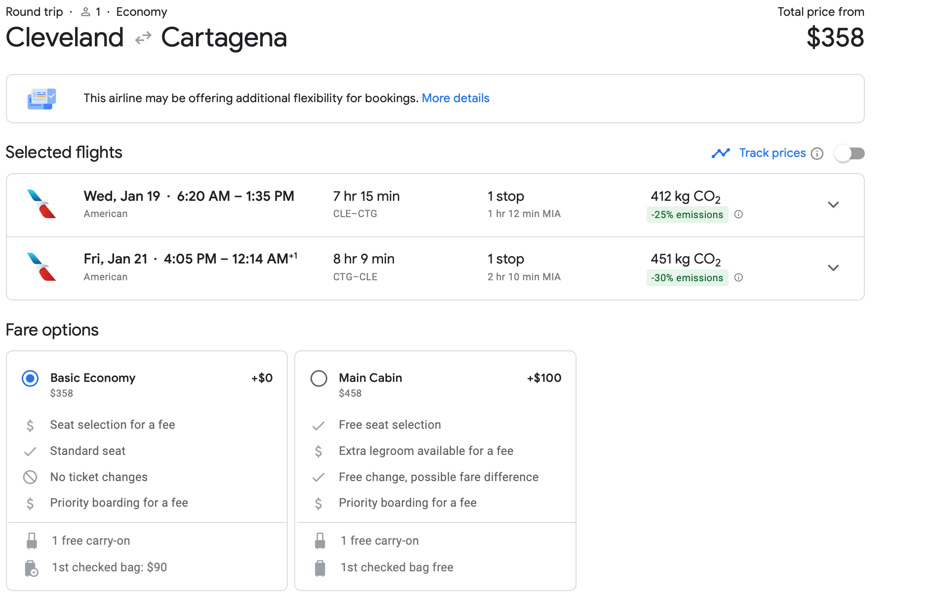 In addition, American has $358 seats available from Cleveland (CLE) to Cartagena. The best availability for these prices was in January, certainly a nice time to exit Ohio and head to the warmer climes of Colombia.