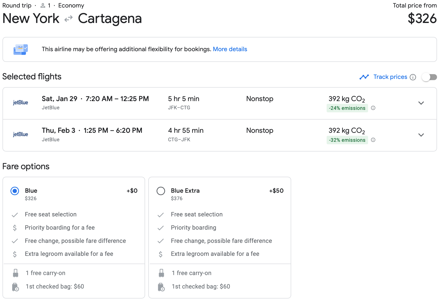On the East Coast, we found fares for nonstop flights on JetBlue from New York City (JFK) to Colombia for just $326, a significant savings from normal prices. That's for a main cabin seat, too (as opposed to the carrier's Blue Basic fares). There's pretty good availability for tickets at this price across January and February. Prices for this route are much more expensive in March and April, so having flexibility in your travel schedule could really pay off here.
