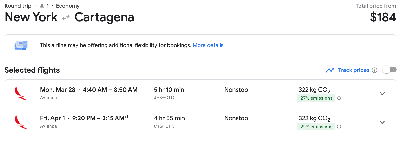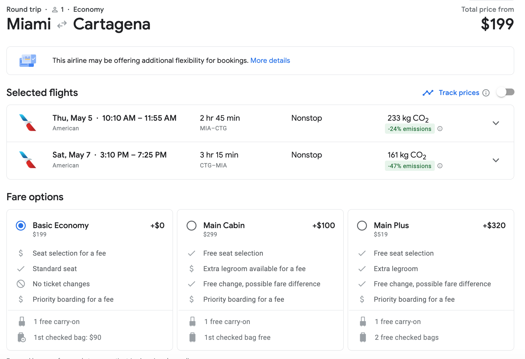 Let's start off with a fabulous fare from Miami (MIA) to Cartagena (CTG) in May for just $199 nonstop. This is for American's basic economy, so there's no seat selection. But you do get to bring a carry-on for free. This fare price is almost half off normal prices we see for this itinerary.