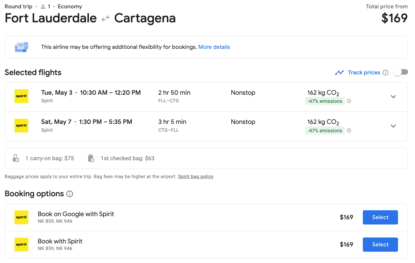Lots of good deals to Cartagena from Fort Lauderdale (FLL) as well. Spirit Airlines has $169 nonstop fares available in April and May. That's an excellent price, but keep in mind with Spirit a carry-on bag will cost you $75 extra and a checked bag $63.