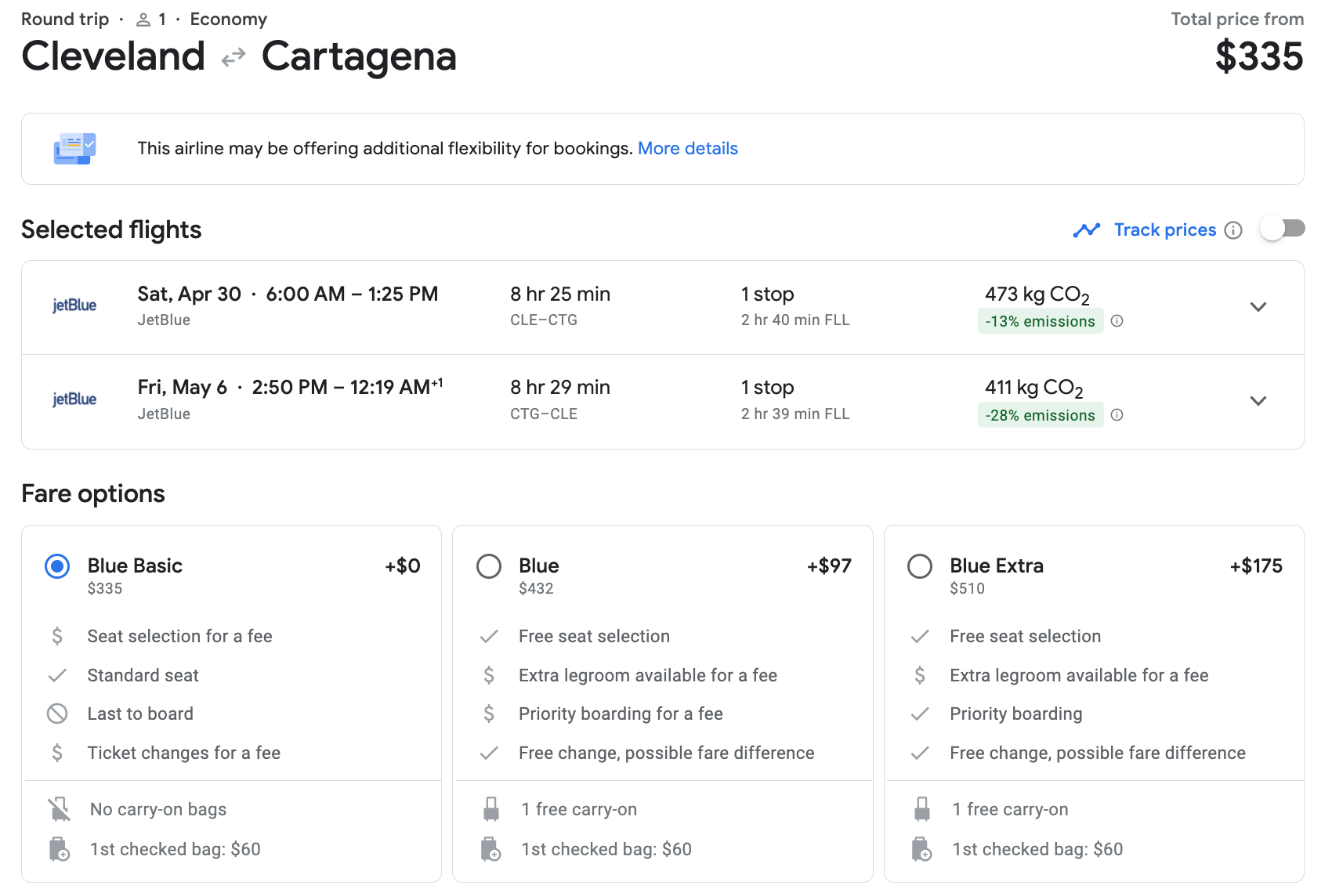 JetBlue has round-trip fares from Cleveland (CLE) to Colombia in April for $335. That's an excellent price for spring travel. It's a Blue Basic ticket, so keep in mind you don't get a free carry-on. Your first checked bag costs you $60.