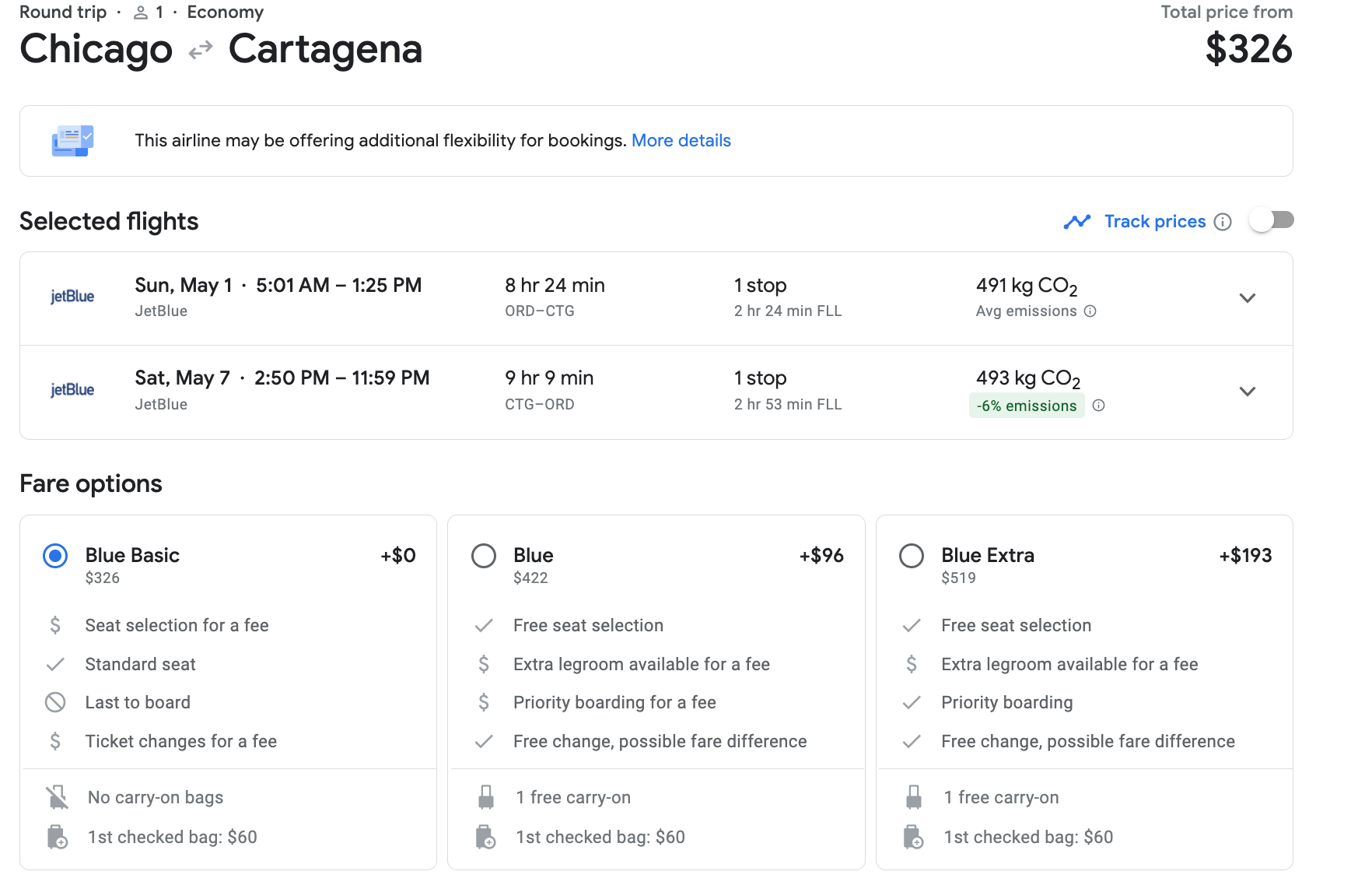 Chicago (ORD) to Cartagena is also available on JetBlue in May for only $326. Again, it's the carrier's no-frills tier so be aware of the fees for checked bags.
