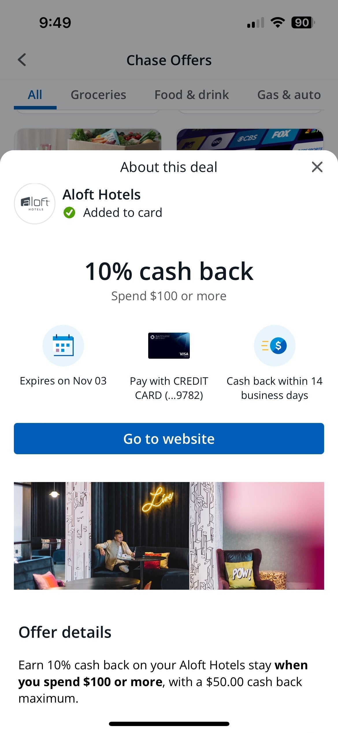 The Chase deal also applies to Aloft Hotel bookings. Spend $100 or more and you'll get 10% cash back, with a $50 cash back cap. (Offer expires Nov. 5.)