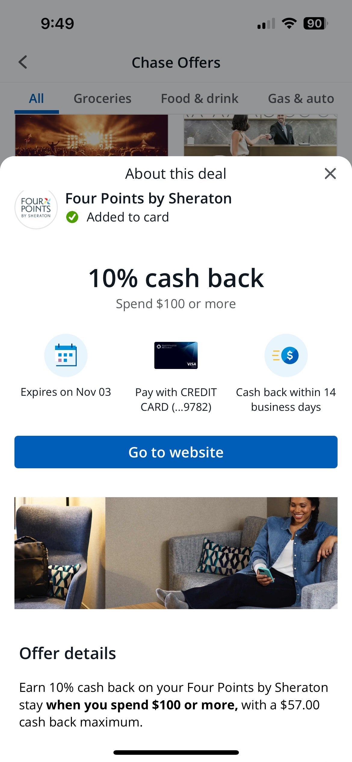 You can also get 10% back at a Four Points by Sheraton hotel after spending at least $100 with a $57 cash back maximum. (Offer expires Nov. 3.) Same terms apply for an AC Hotel booking. The only difference is that the AC Hotel offer expires on Nov. 11.