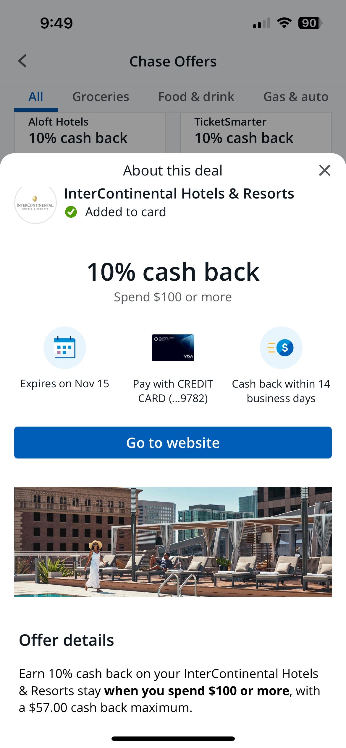 The 10% cash back deal also applies to a stay at an InterContinental property where you spend at least $100. That has a $57 cash back maximum. (Offer expires Nov. 15.)