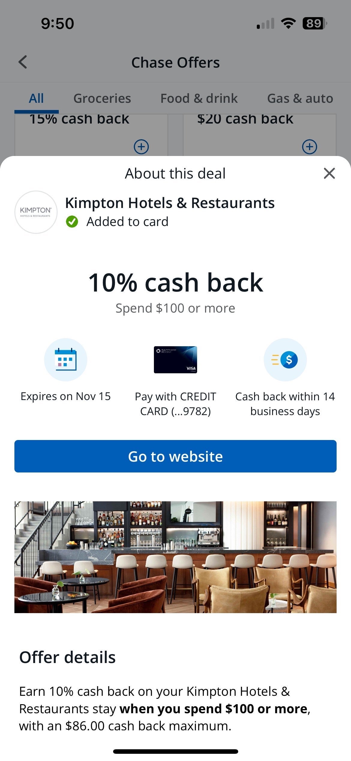 Chase cardholders can earn 10% cash back on their hotel bookings at a number of different hotel chains. Note that each offer has specific cash back maximums. For example, guests can earn 10% cash back by spending $100 or more at Kimpton Hotels & Restaurants, with an $86 cash back maximum. (Offer expires Nov. 15.)