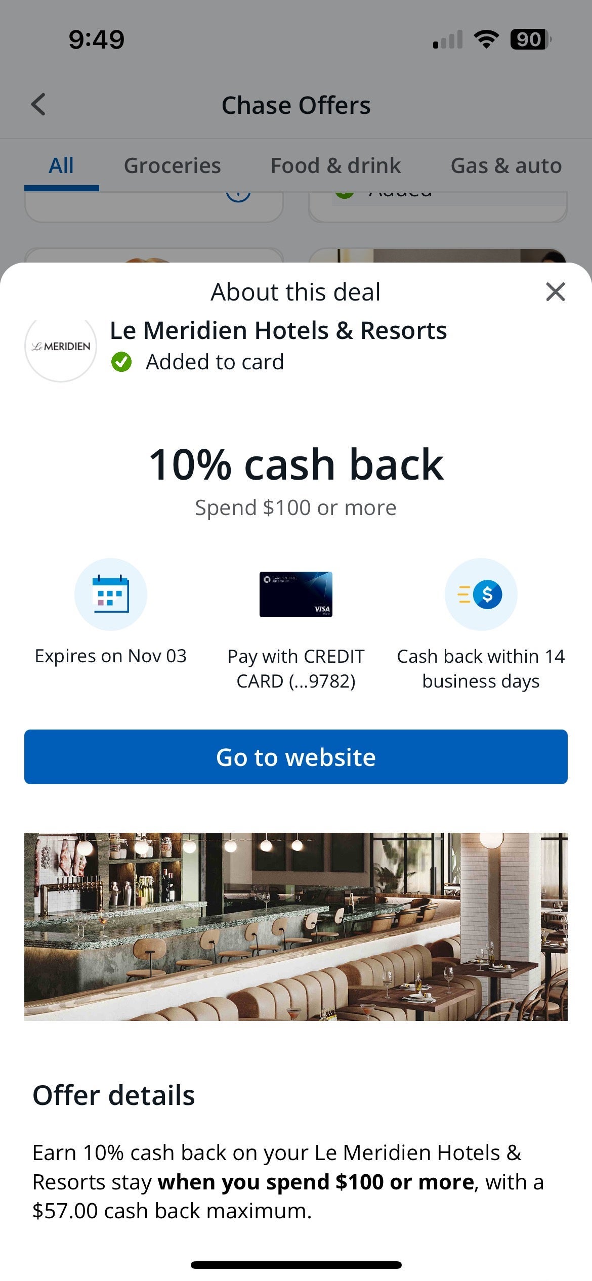 You can earn the same 10% cash back if you spend at least $100 at a stay at a Le Meridian Hotels & Resorts property. The cash back max for this offer is $57. (Offer expires Nov. 3.)
