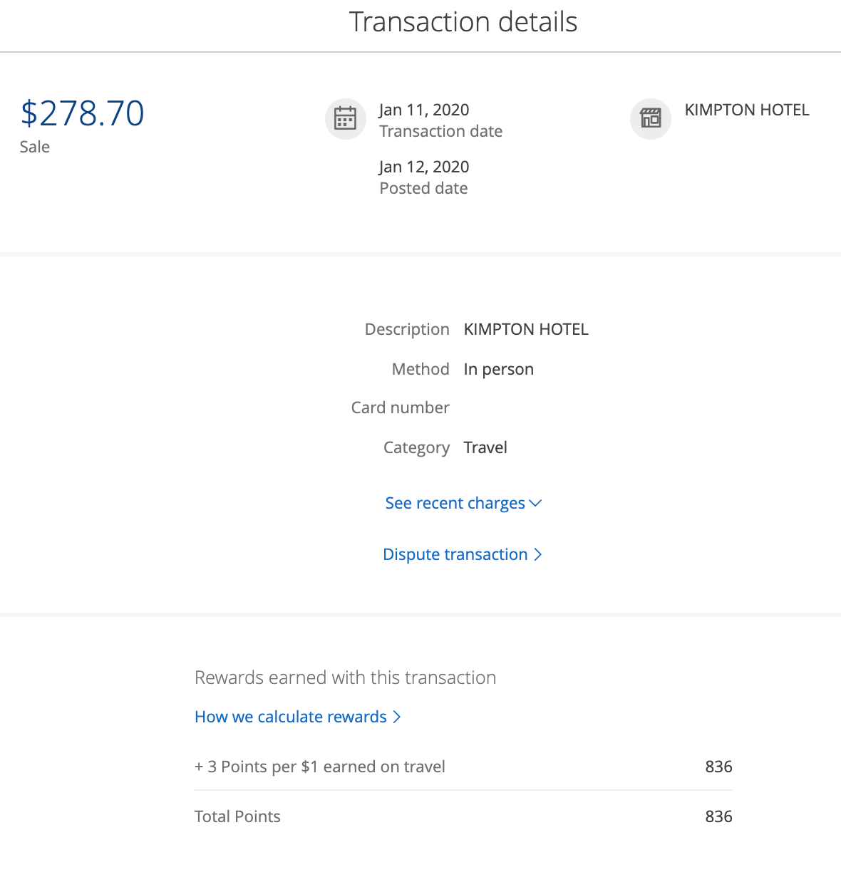 In Taiwan, higher-end restaurants charge a flat 10% service fee in lieu of tips, so my IHG discount directly canceled out the service fee. Our total bill was $278.70, and I earned 836 Chase Ultimate Rewards points for the charge since the purchase coded as "travel" under Kimpton Hotels. (Note that, since I paid with my Chase Sapphire Reserve, I would have earned 3x per dollar even if the purchase had coded under the dining category.)