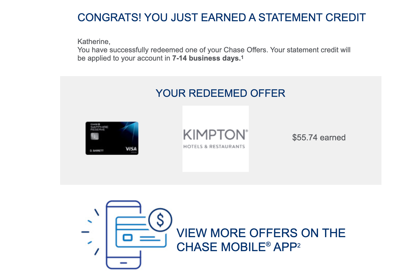 Four days later, I received an email from Chase congratulating me on redeeming one of my card offers: The Kimpton offer did, in fact, work for my restaurant charge, and I had earned $55.74.