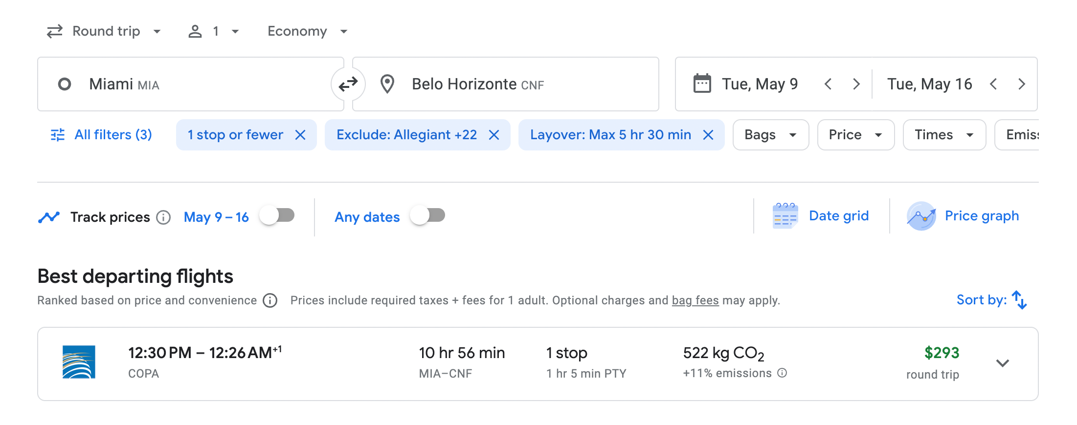 Google Flights shows how good of a deal the $293 fare is for a round trip from Miami to Belo Horizonte — all the other available flights cost at least $800.