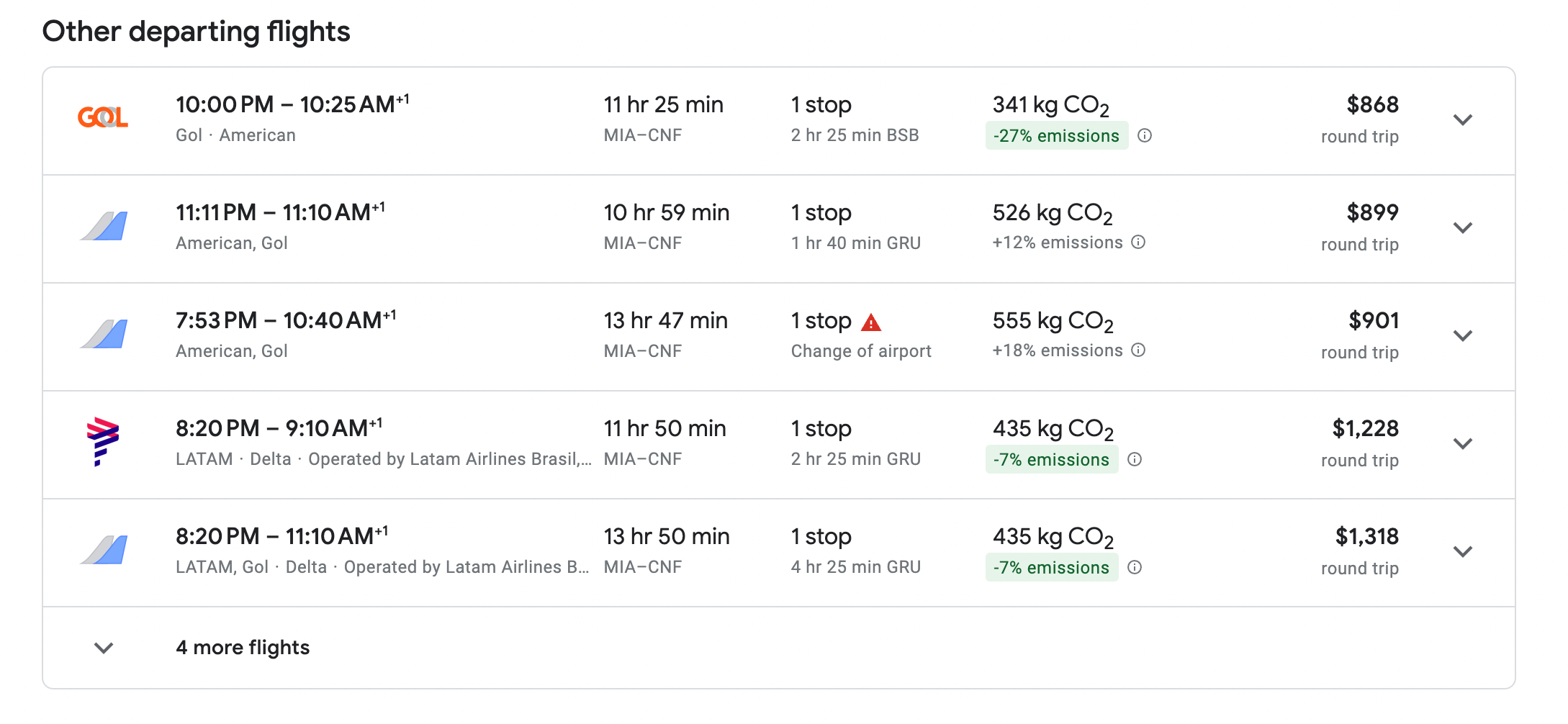 - Copa: Miami International Airport (MIA) to Tancredo Neves International Airport (CNF), starting at $293 (includes a layover in Panama City).