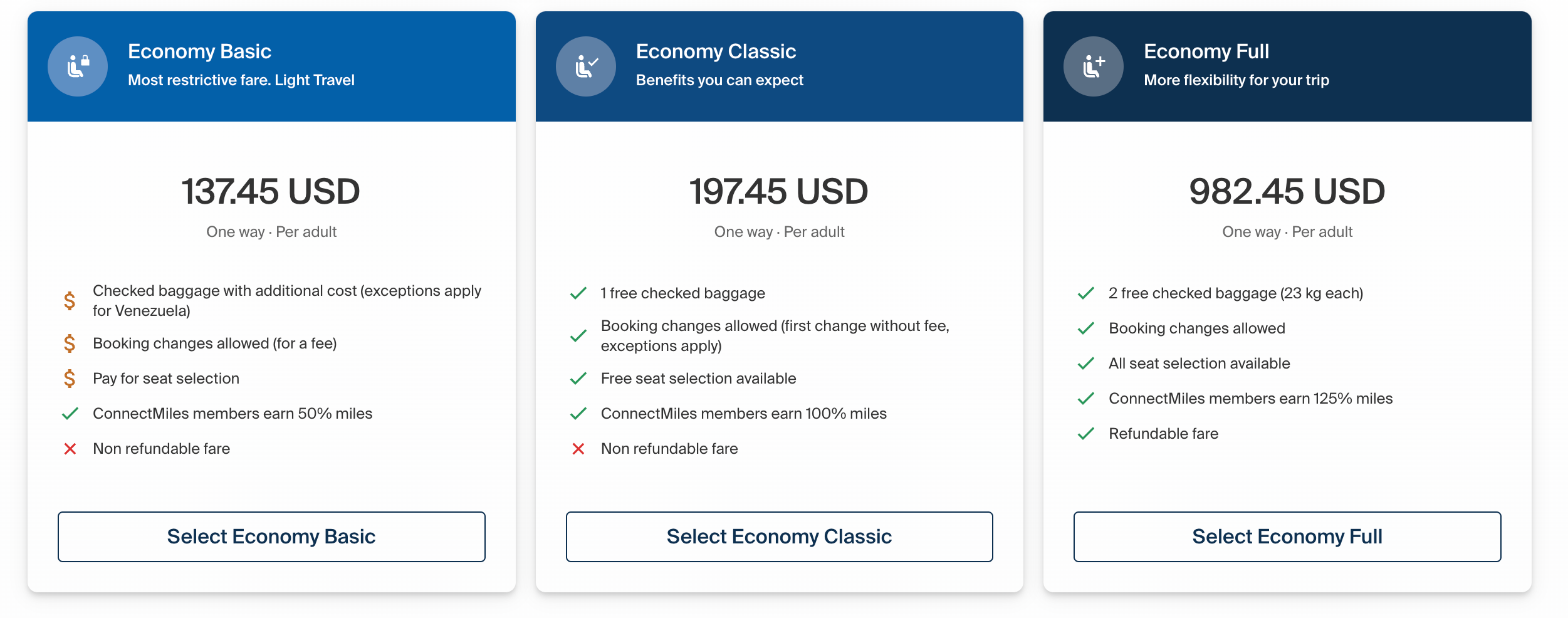 The fares featured in these deals are for basic economy only. Copa's basic economy charges fees for checked baggage, seat selection and booking changes.
