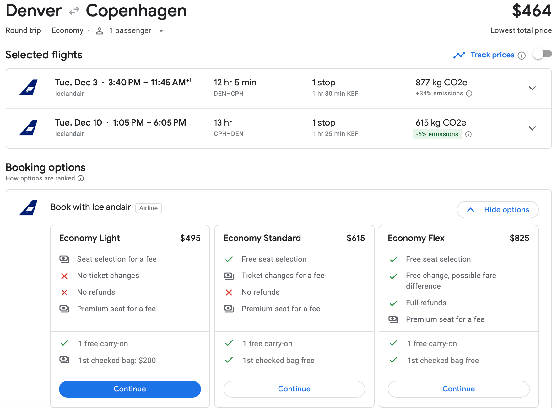 There are also discounted flights to Denmark. For example, this itinerary on Icelandair from Denver to Copenhagen in early December is just $464 round-trip — a great price for this route during the holidays. You get a free carry-on, but try and pack light, as it will cost you $100 each way to check a bag.