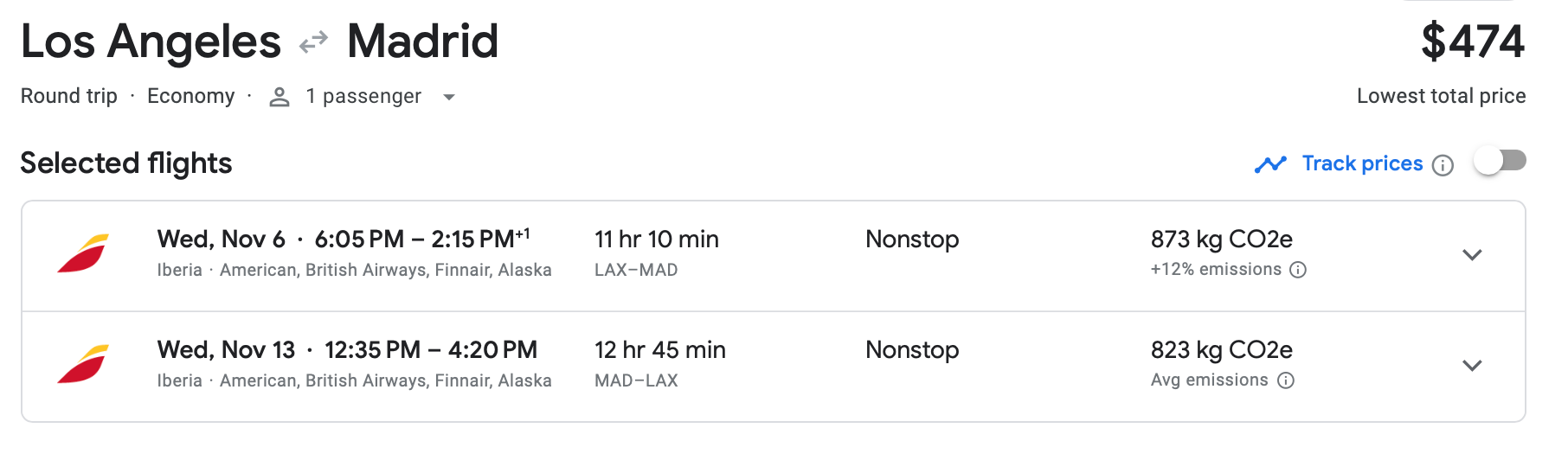 Los Angeles-to-Madrid routes in November are also available at a substantial discount. This nonstop route from LAX to MAD on Iberia is available for just $474.