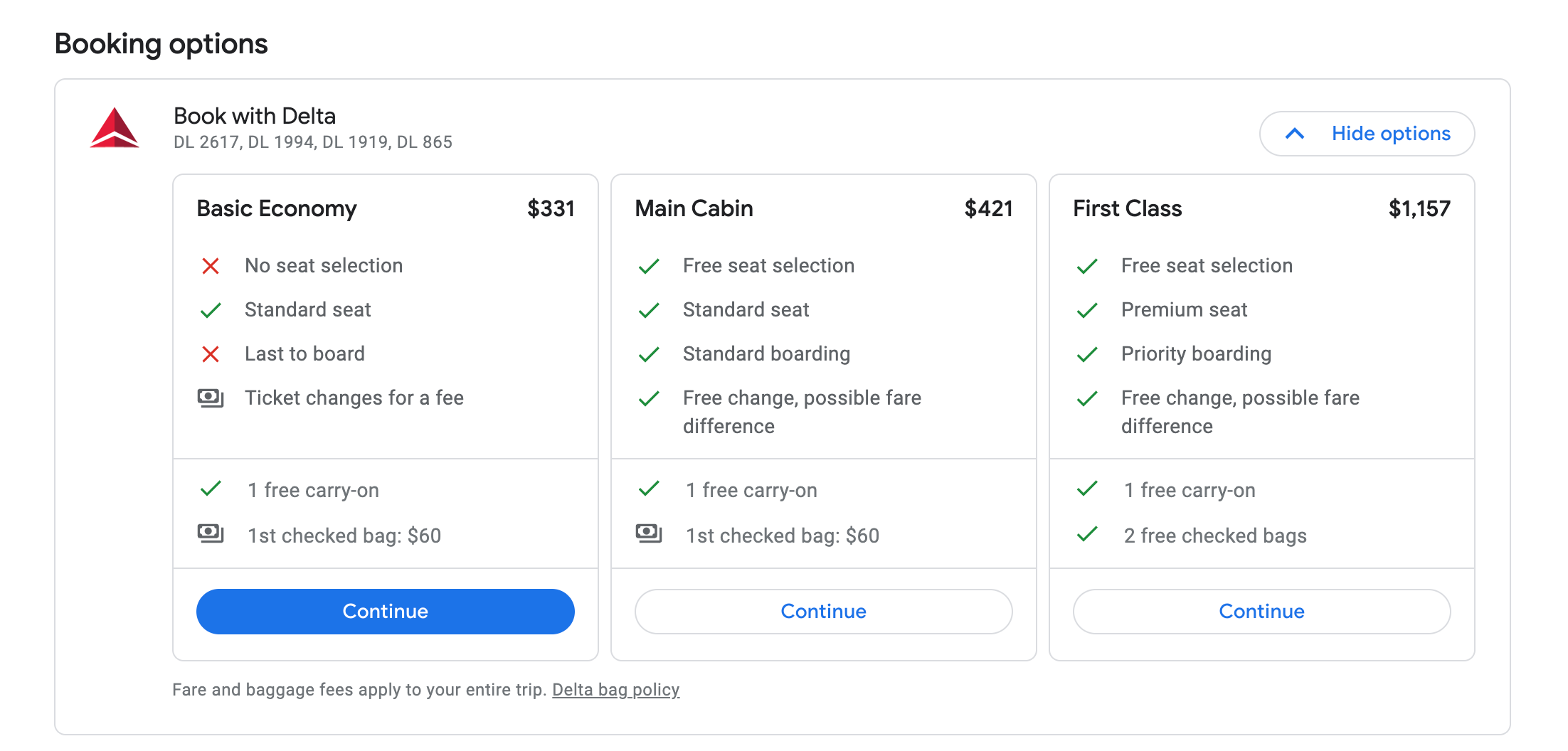 If you book Delta's basic economy class, you can bring one carry-on bag but won't be able to select your seat or change your ticket for free. You can upgrade to Main Cabin for an extra $90.