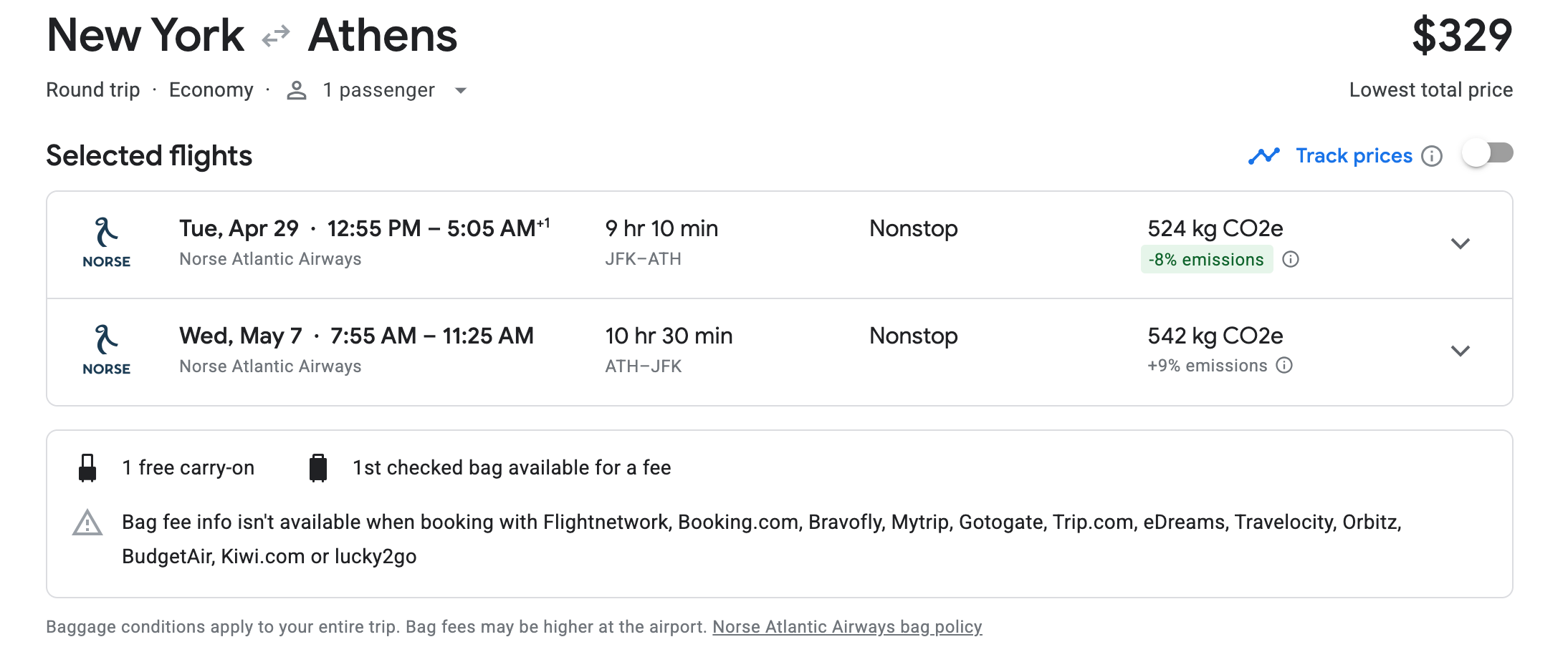 The lowest price to Europe with Norse Atlantic we found came in at $329. This round-trip itinerary involves flying from JFK to Athens International Airport (ATH) on April 29 and returning May 7.