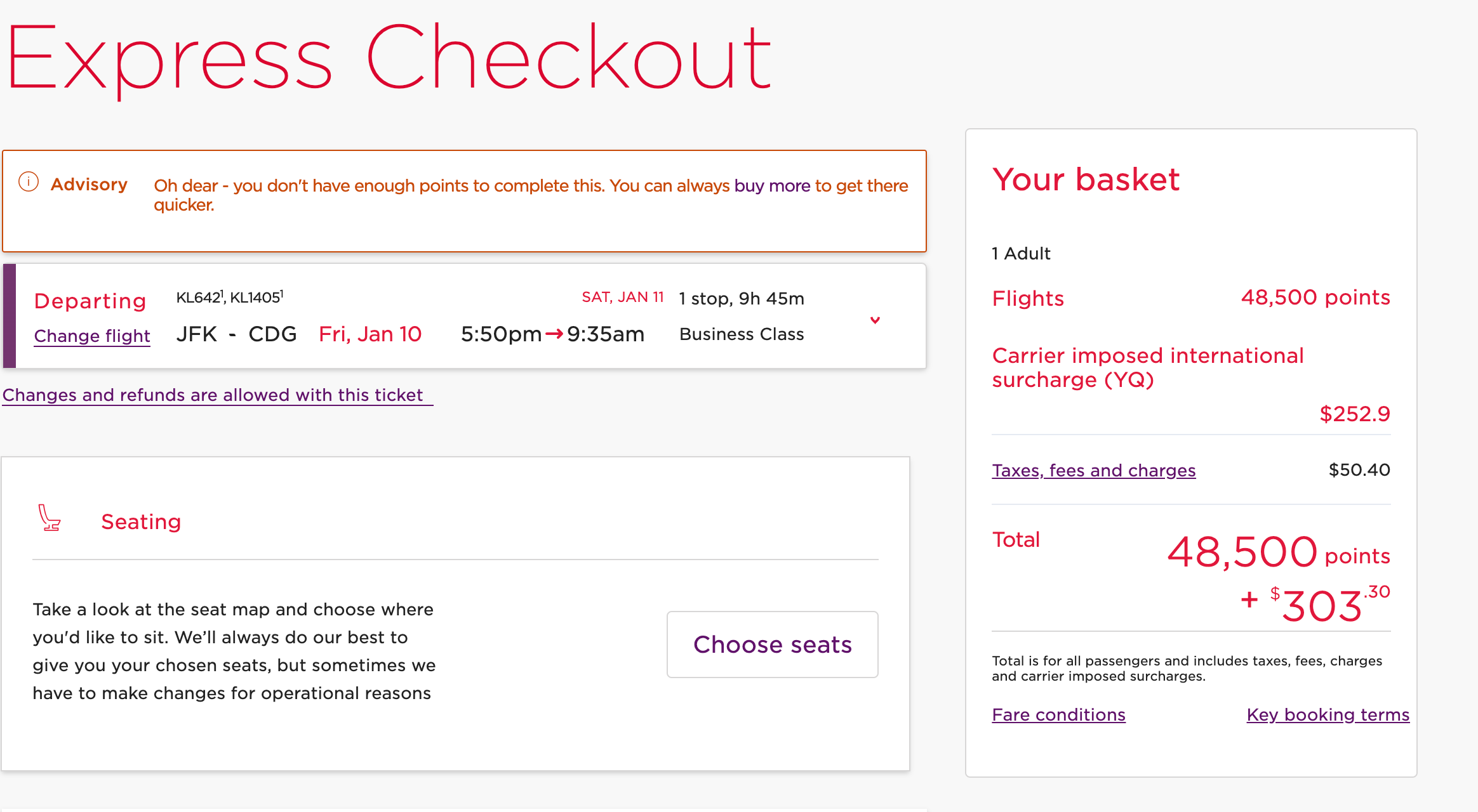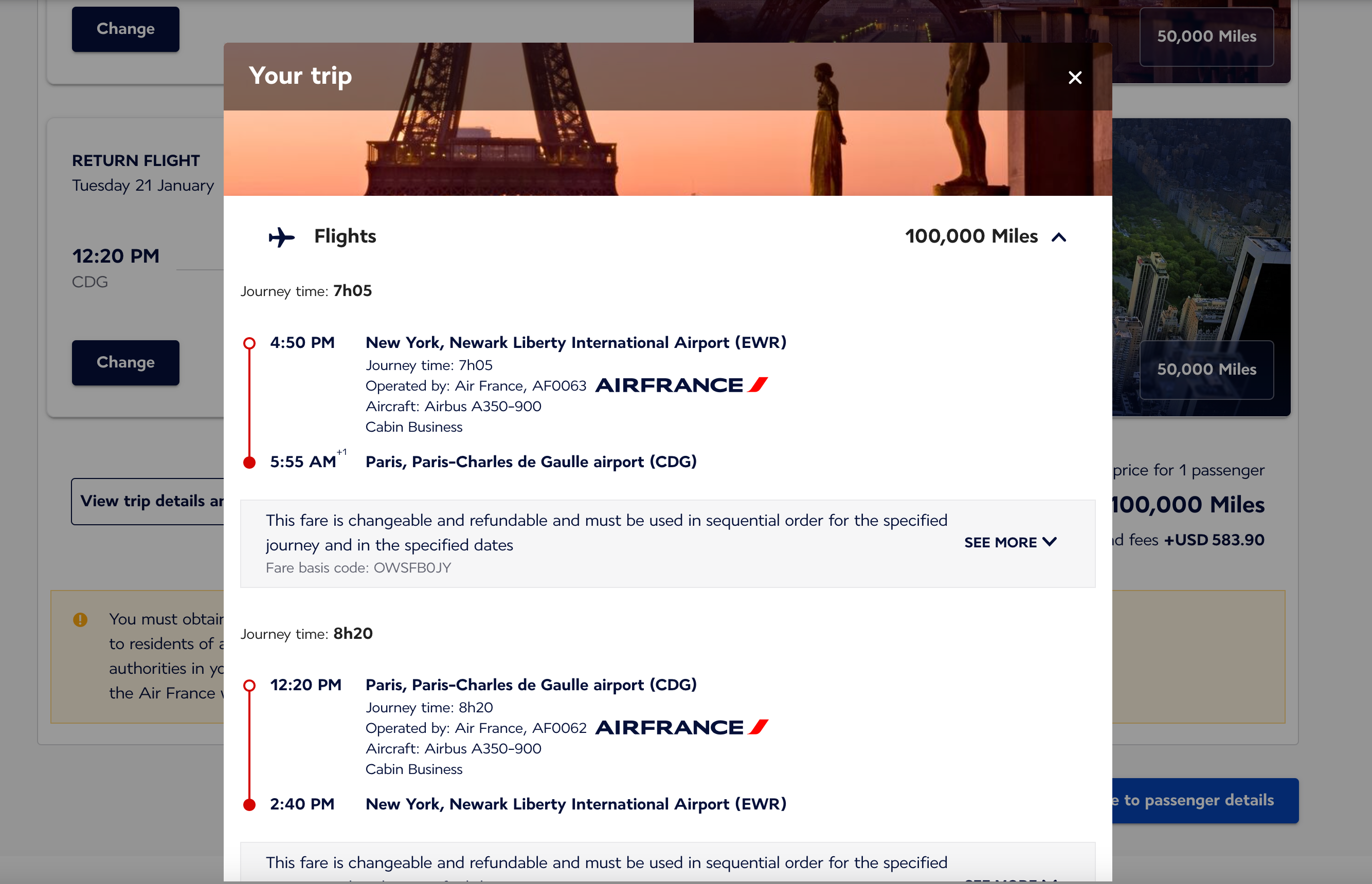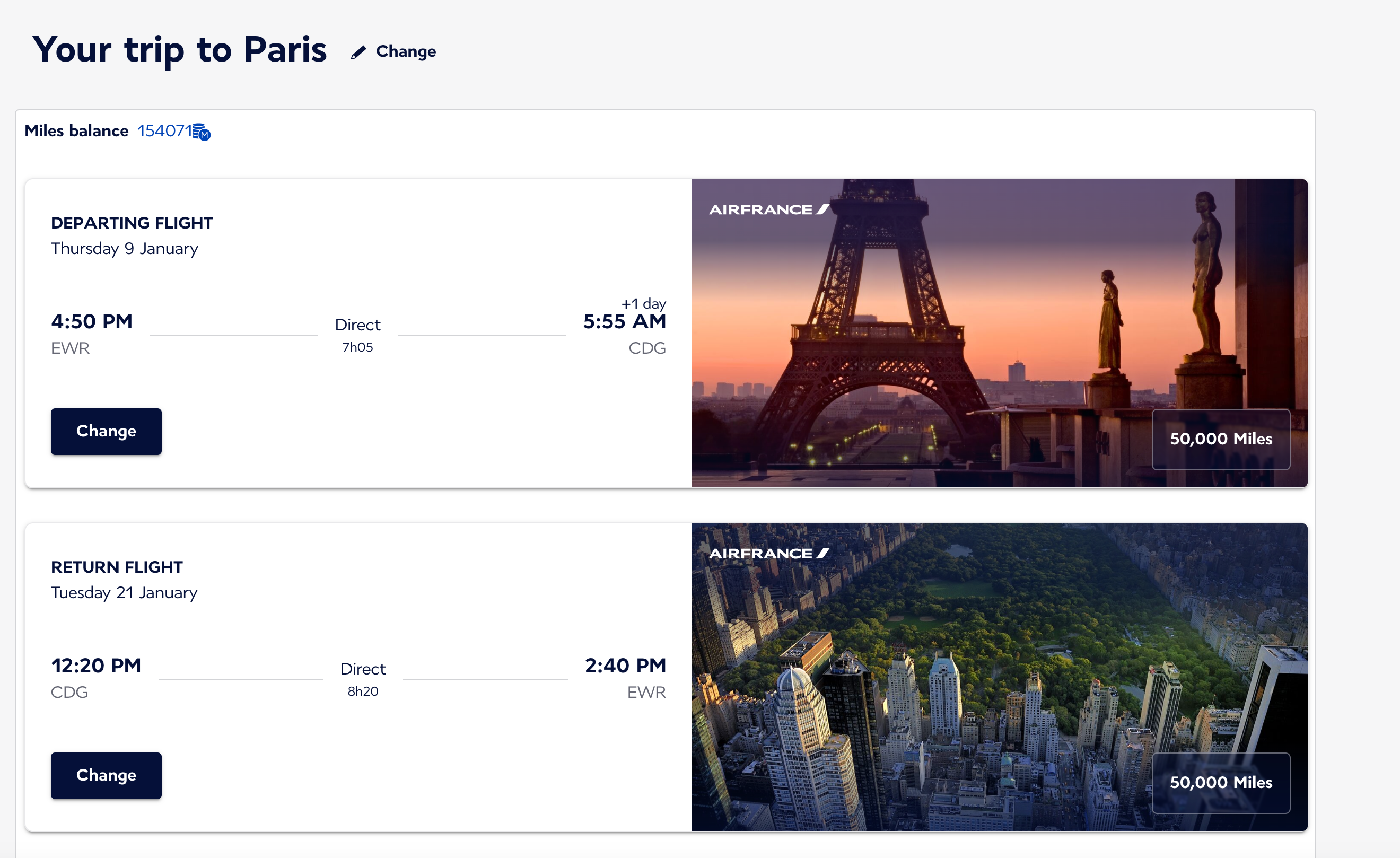 This January flight between New York's John F. Kennedy International Airport (JFK) and Paris-Charles de Gaulle Airport (CDG) only costs 50,000 Flying Blue miles plus $291 in taxes and fees each way.